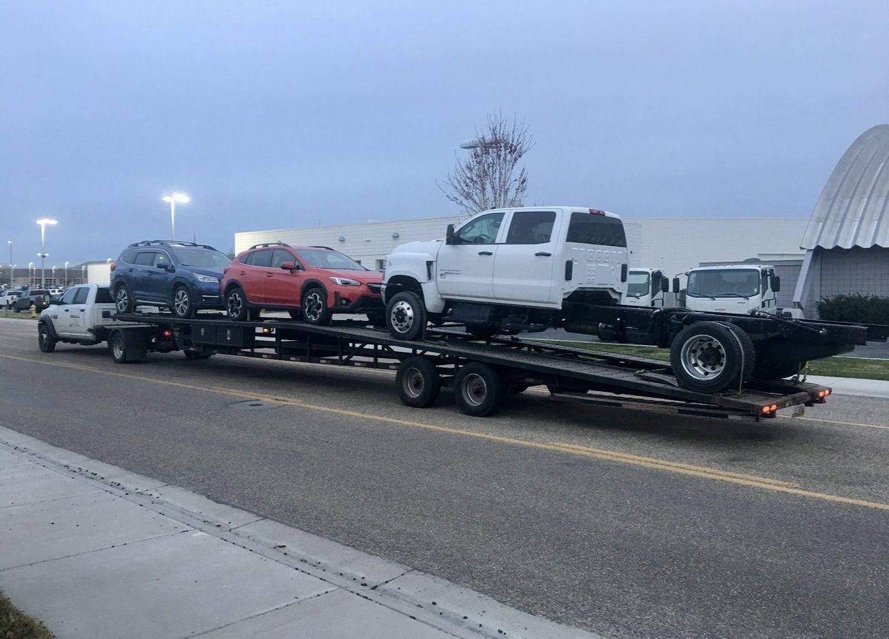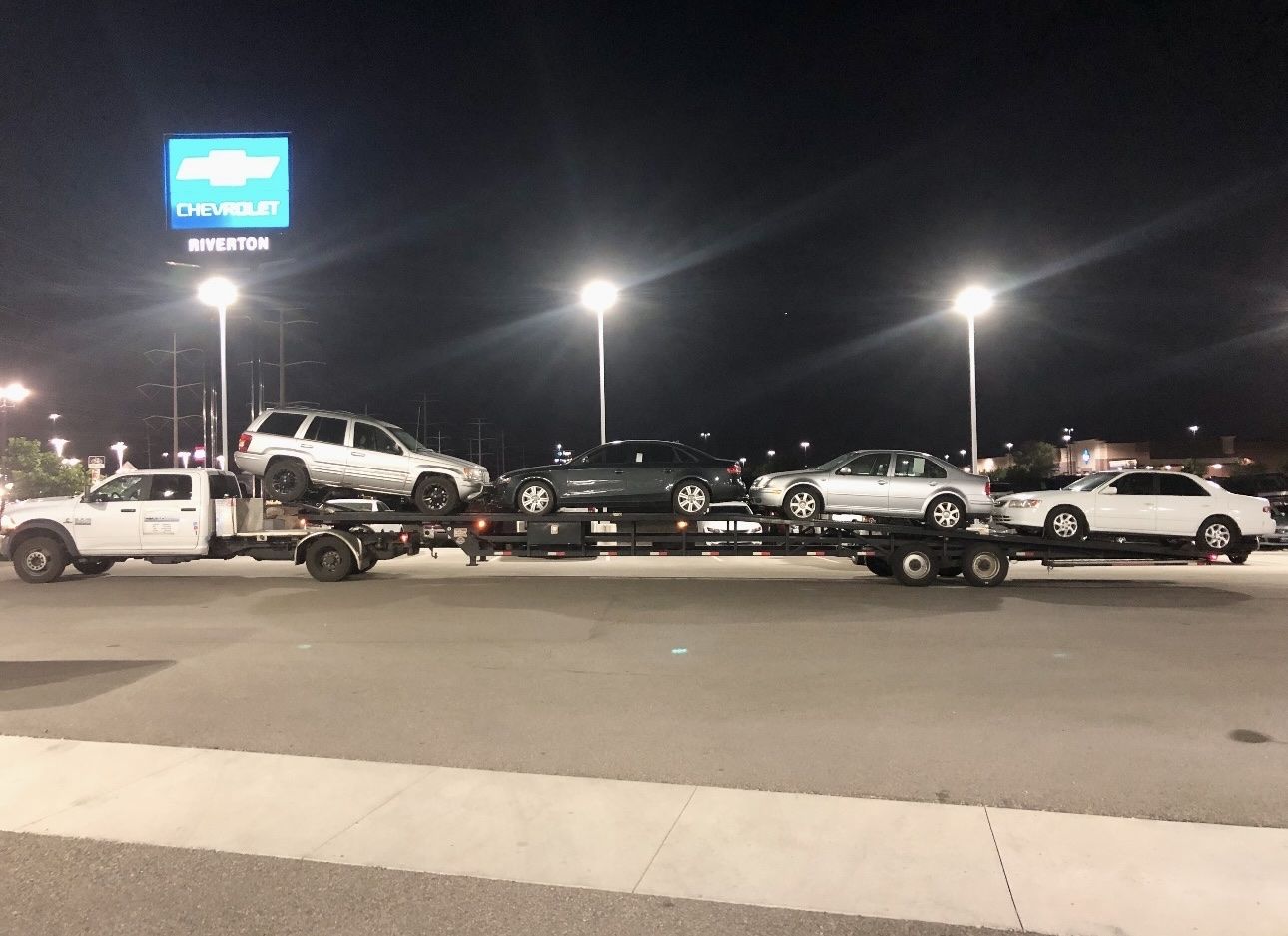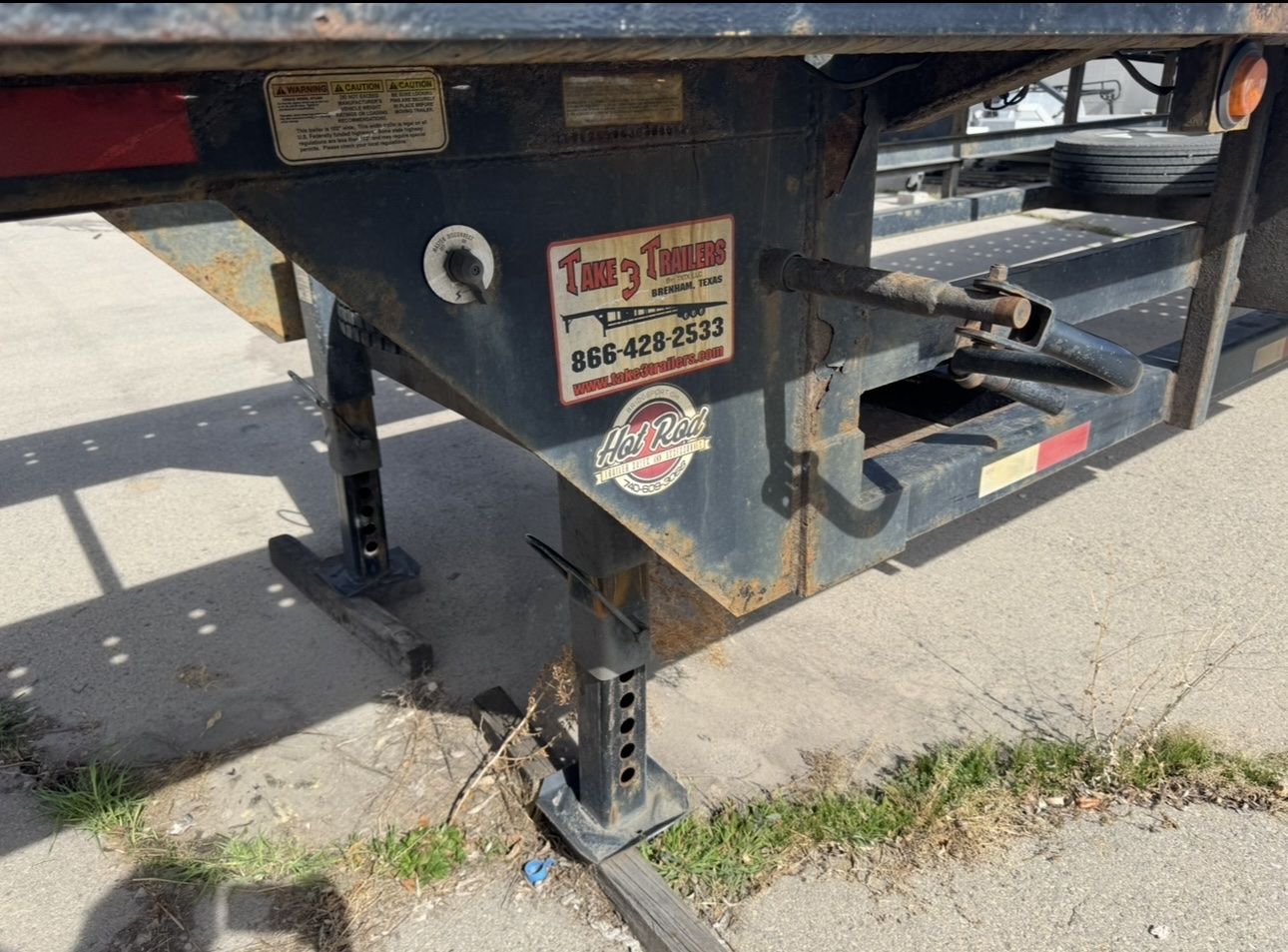 Venmo2018 Take 3 Lo Pro 53’ w/extentions front and rear(2 ft), 8.5ft wide, two 10K super single axles, kingpin hitch, four toolboxes, electric over hydraulic brakes, 7 pin plug, two new spare tires on rims, over the wheel straps and ratchets included. Electric over hydraulic brakes. Dry weight is 6000lbs. 3-4 car capacity. Conveniently lower to the ground for loading and strapping compared to wedge style gooseneck options. Can be hauled with medium duty chassis cab power units beginning with 3500/350 and on up.