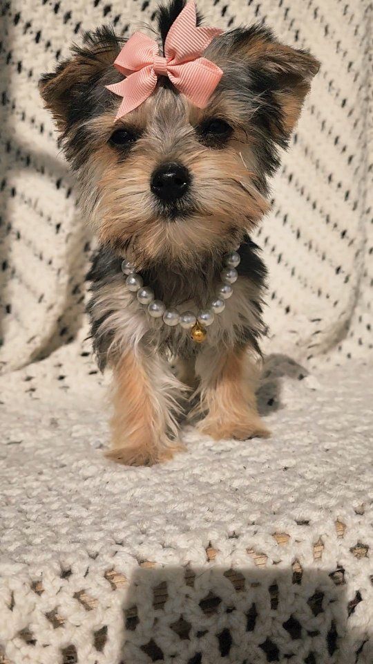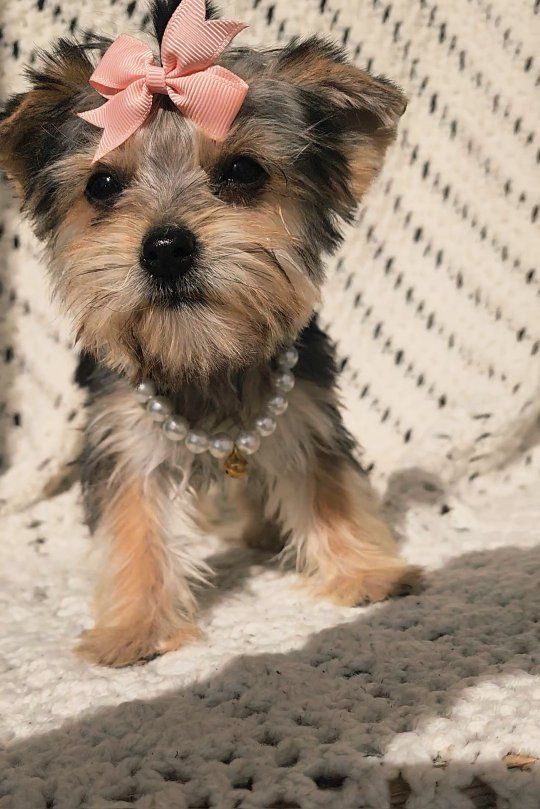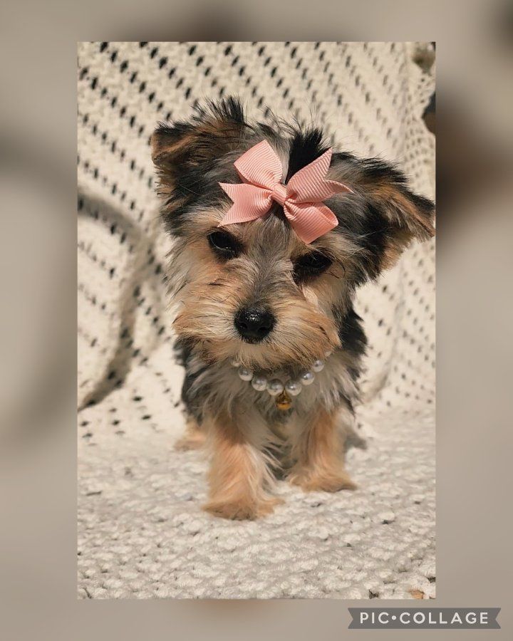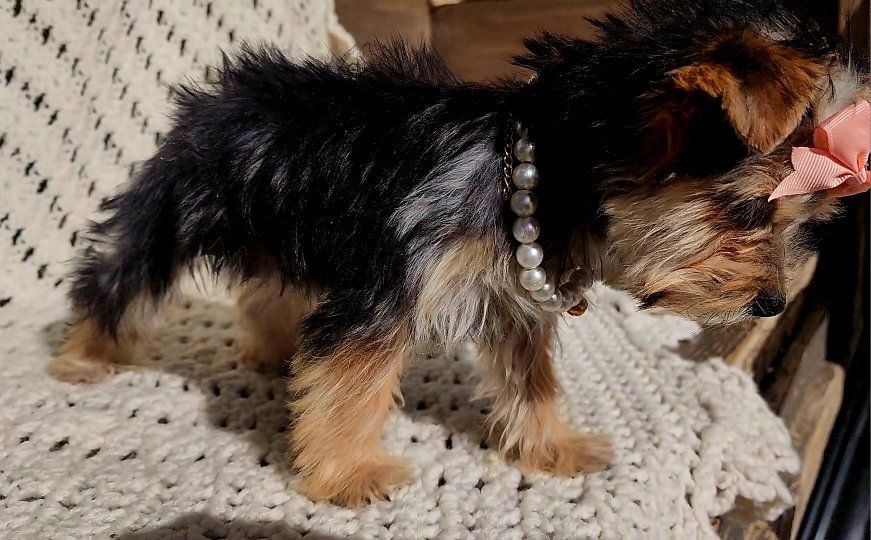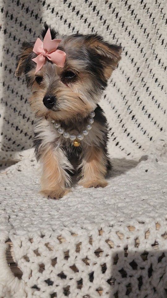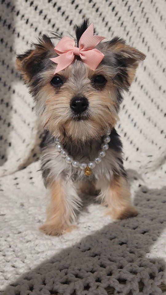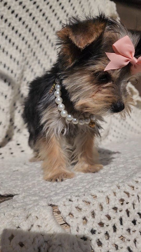 About Her: Breed: Yorkshire Terrier (Yorkie) Gender: Female Personality: Gentle, playful, and loves to cuddle Raised in a loving home and well-socialized She even comes with her own signature style—just look at that cute bow and her little necklace! This tiny girl is perfect for families or anyone wanting a loyal, affectionate companion. She is AKC registered and we are asking for 500.00 for her papers. Call or text with any questions.