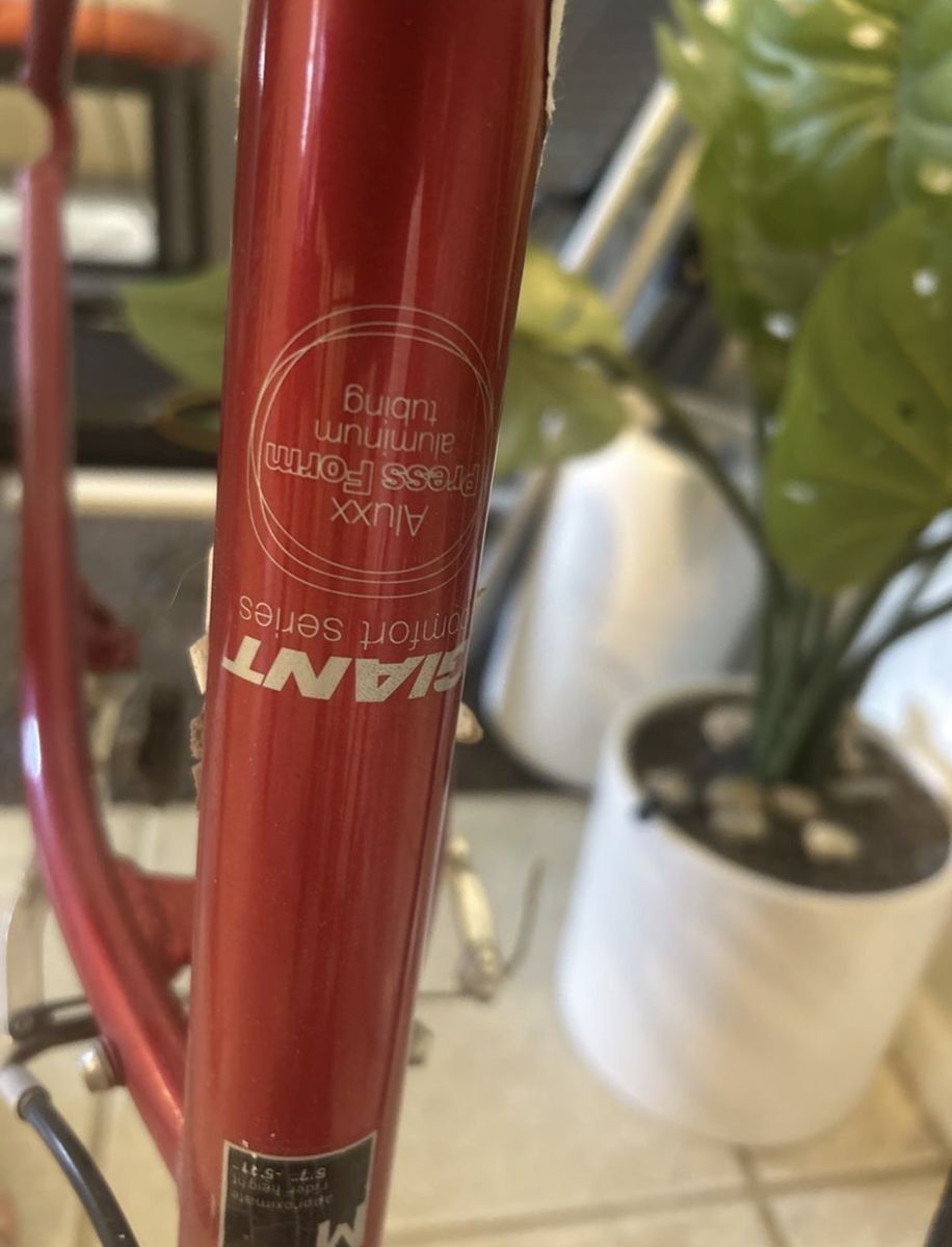 ApplePayGiant Comfort Series Hybrid Aluxxx Press Form Aluminum Unisex bike in candy apple red gifted to me many years ago. Has a flat back tire but otherwise rides nicely. Breaks are in working order. Seat is intact. A little dusty from being put away. Has stickers on it from my youth.