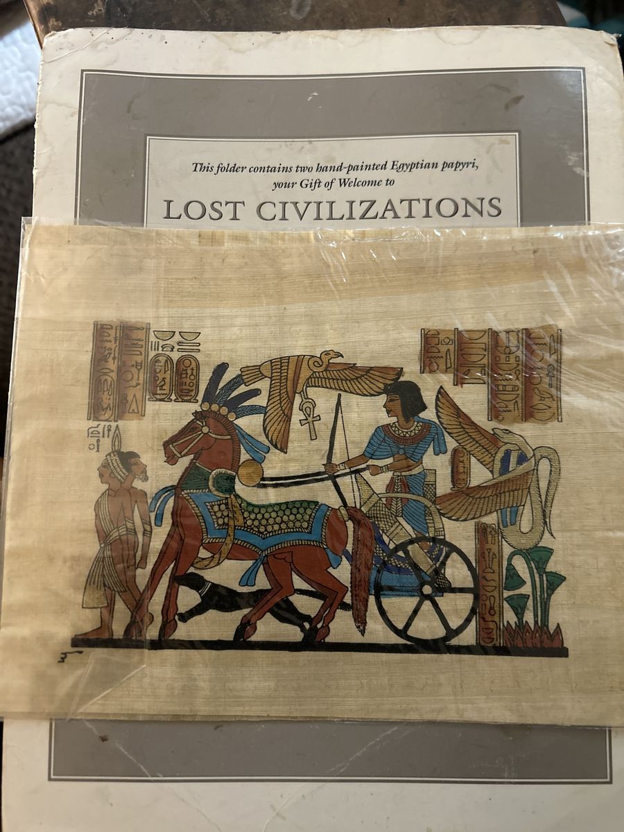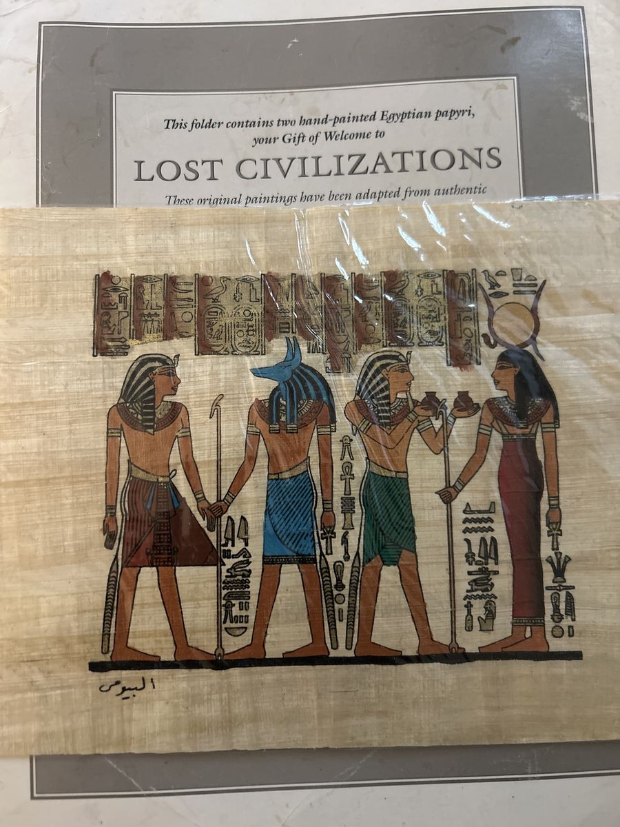 ApplePayFor sale are 2 hand-painted Egyptian papyri. These were part of the welcome package when I signed up for a Time Life book series "Lost Civilizations." These are about 30 years old but were never removed from their plastic sleeves. Each measures 9 x 7 inches. Very vibrant colors. Signed by the artists who painted them.