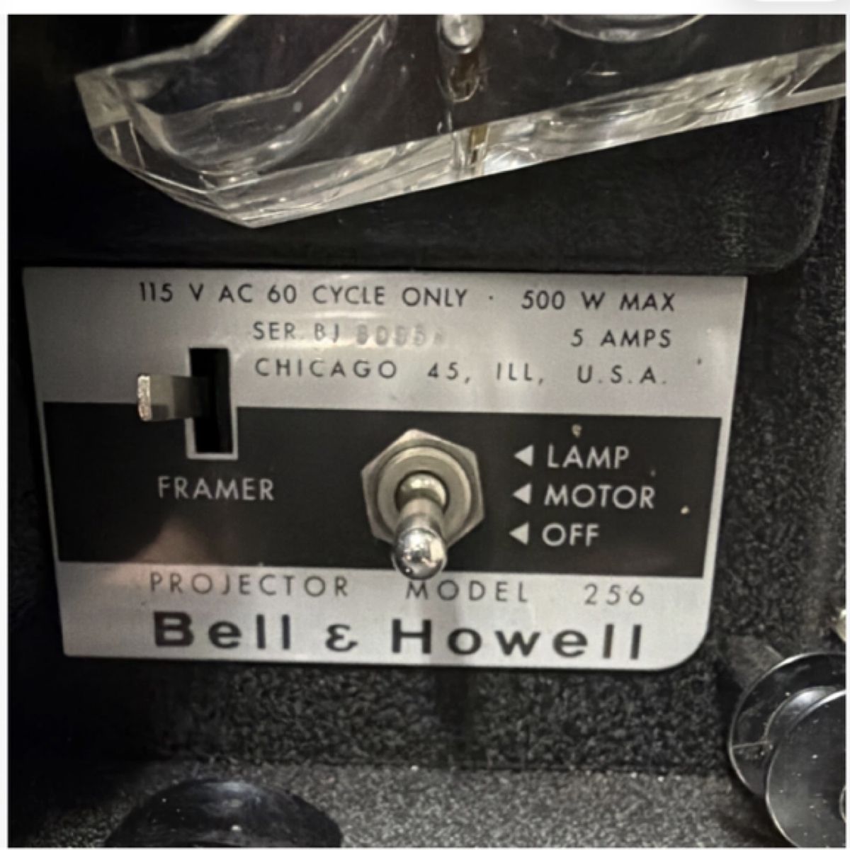 Features include • Auto-Load mechanism — The distinctive silver reel arms and threading system automatically loads the film (a big selling point at the time). • Controls — Lamp/motor switch (with OFF/LAMP/MOTOR positions), framer knob, and rear access panel matching the exact label style. • Power specs — 115V AC, 60-cycle, up to 500W (standard for these models). • Accessories — Original black “Bell & Howell AUTO LOAD” carrying case, one plastic 8mm reel with power cord, and the projector itself. These were extremely popular for family home movies before video cameras took over. It’s not Super 8; it’s built for regular 8mm silent film.