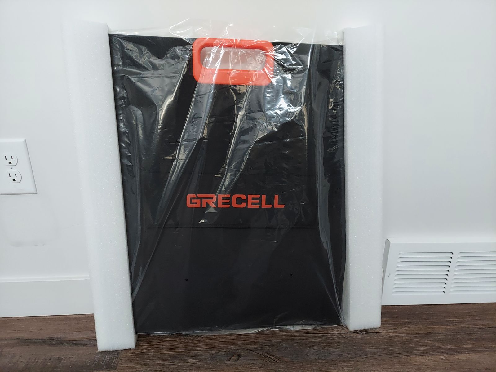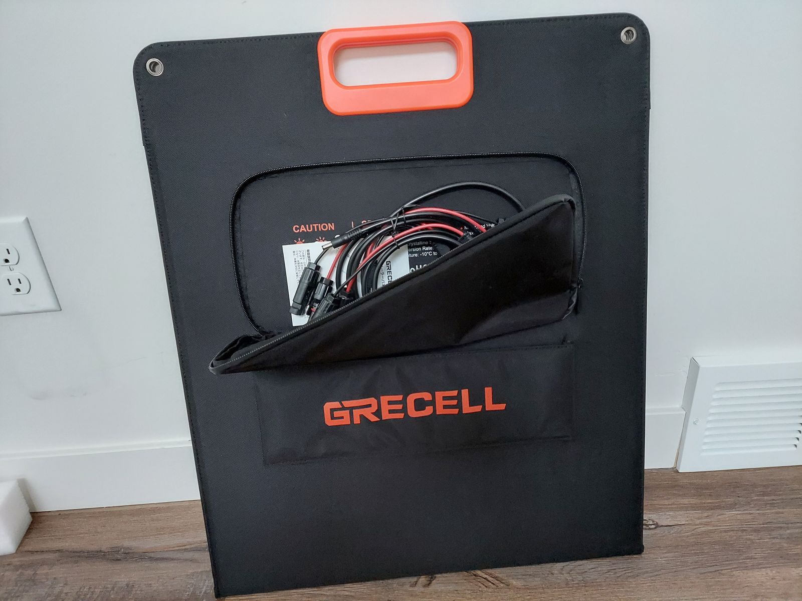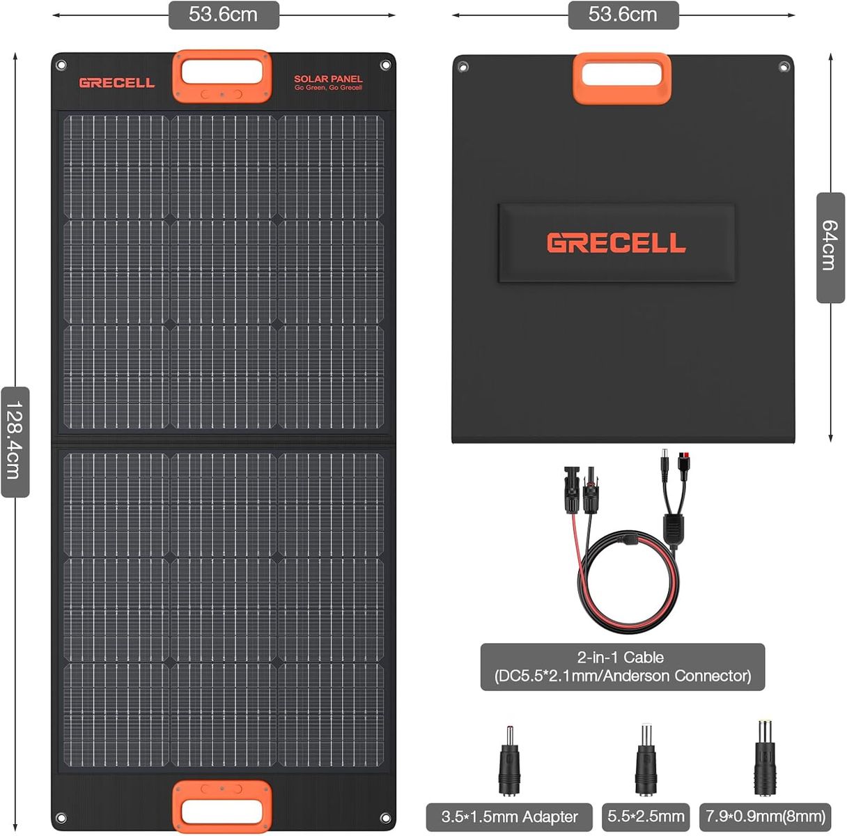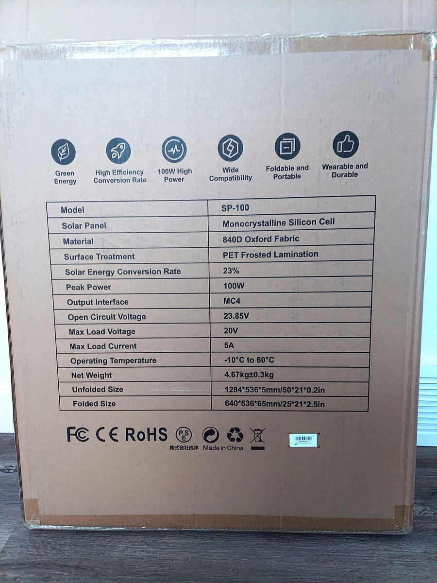 Brand New 100 Watt Portable Solar Panel for Off-Grid Clean Electricity. Made of Monocycline Silicon with high 23% electrical efficiency and stores in a heavy canvas package. Comes with many adapters for different brands of solar battery generators. A zipper pocket holds the accessories.This folds compactly and has grommet holes to hang from trees, tent, or vehicle. Magnets hold the solar panel together for easy carrying. Dimensions folded are 25"x21"x2.5". Unfolded it is 50"x21"x.02" and is lightweight to carry easily.