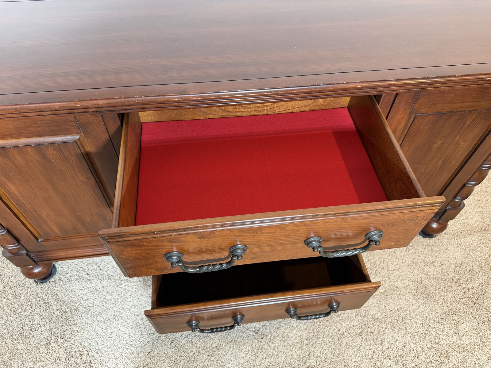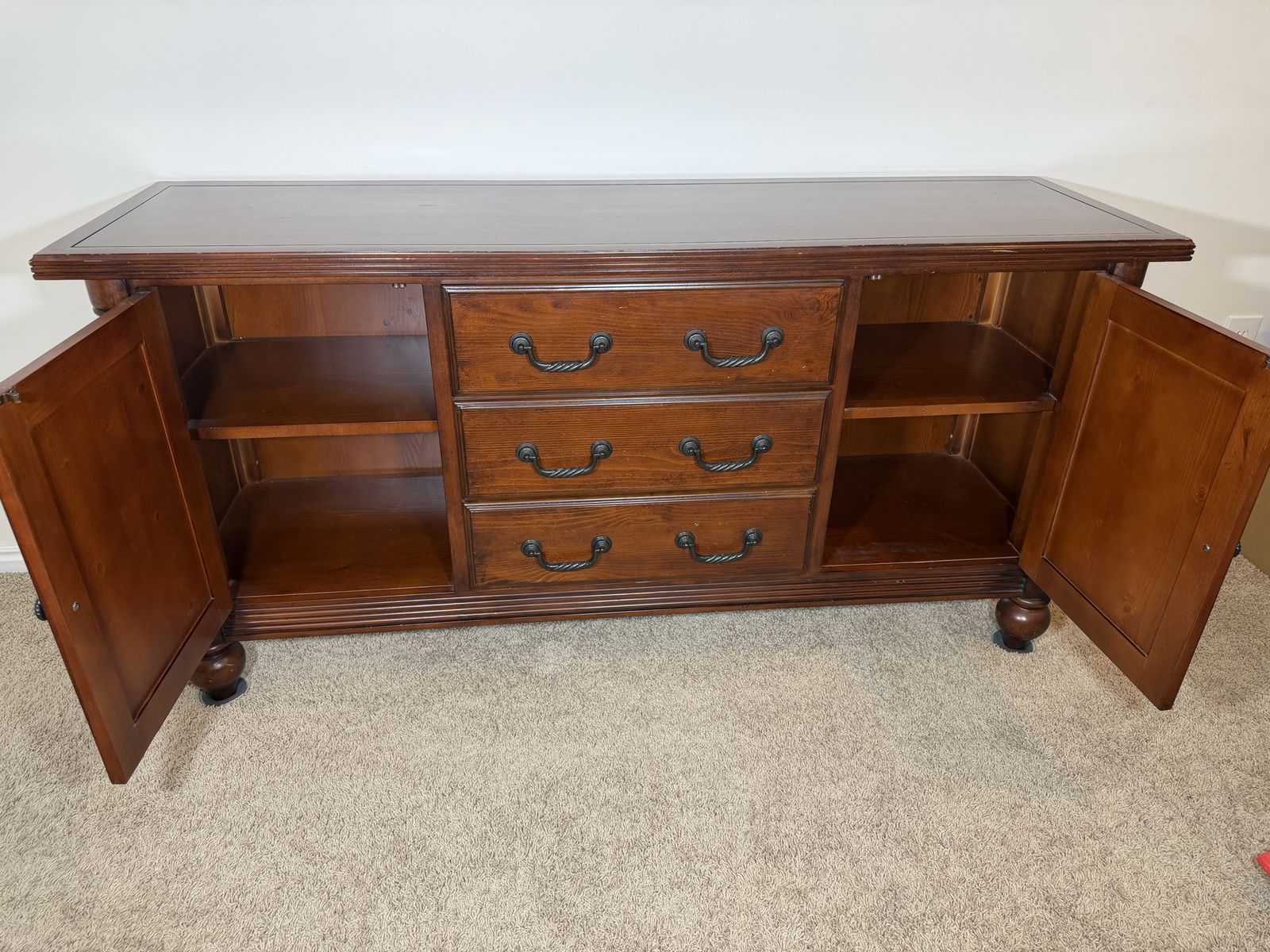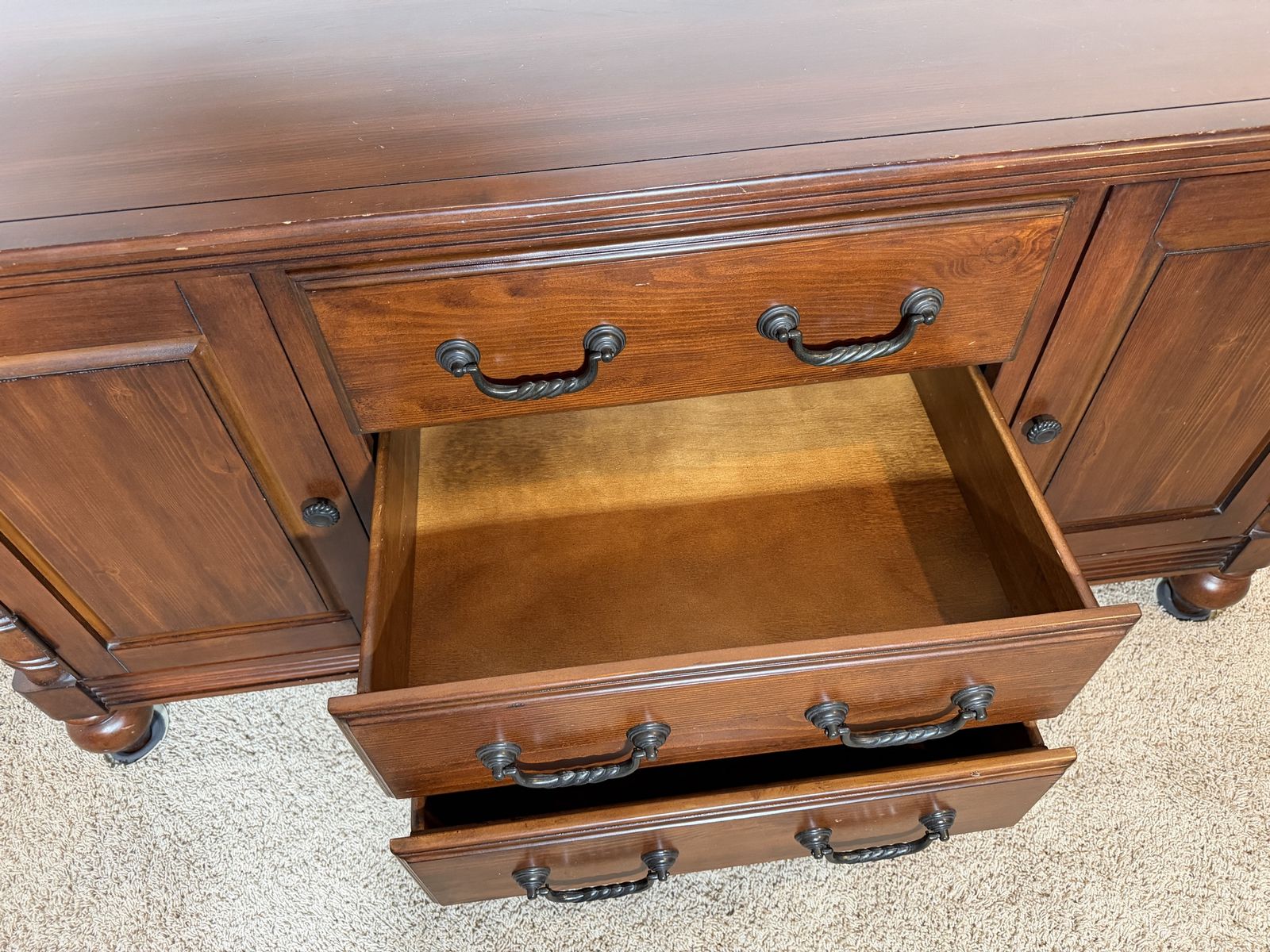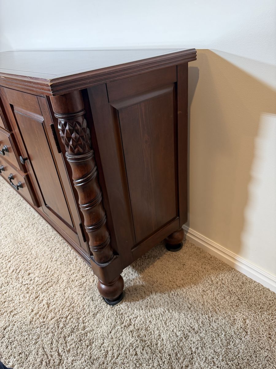 VenmoCredenza / Buffet / Sideboard - Dark Mahogany color. Features include rope carving, raised panel doors, iron styled hardware. Fairly good condition with signs of normal usage and wear.