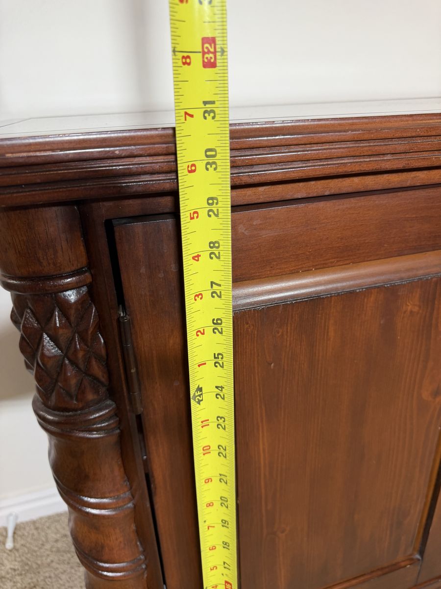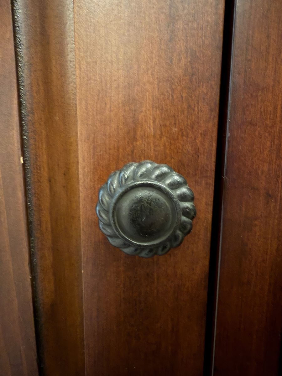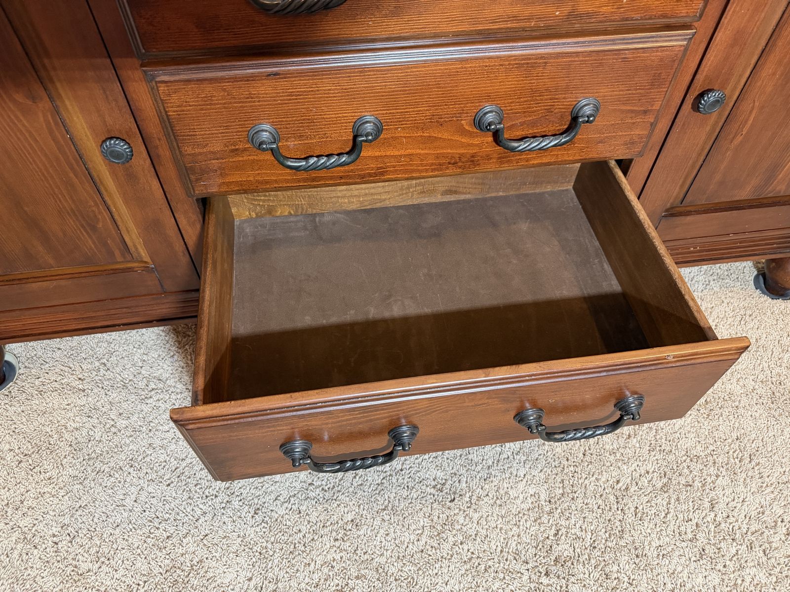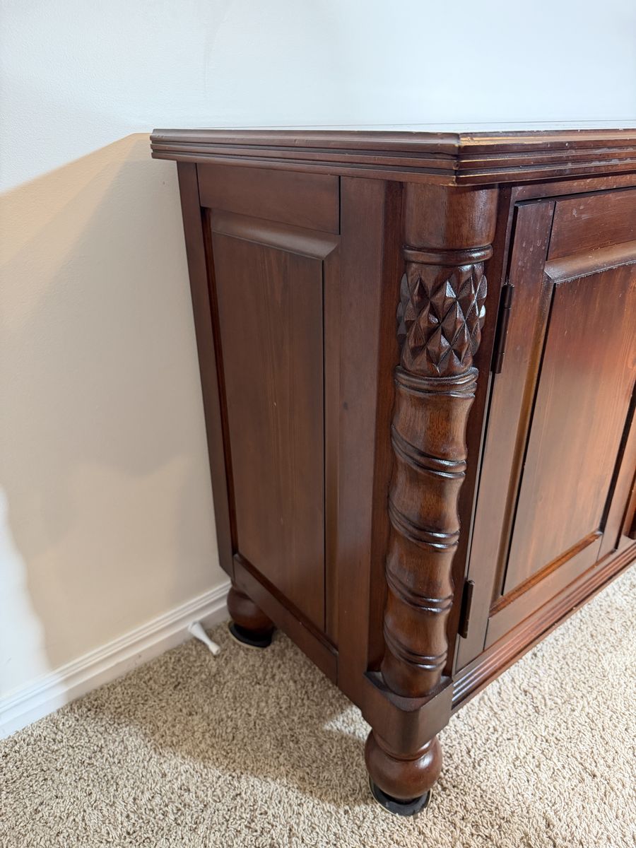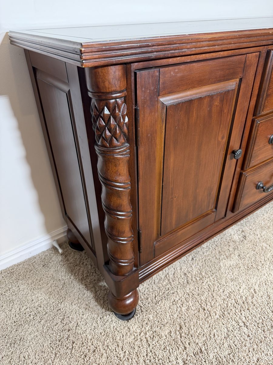 VenmoCredenza / Buffet / Sideboard - Dark Mahogany color. Features include rope carving, raised panel doors, iron styled hardware. Fairly good condition with signs of normal usage and wear.