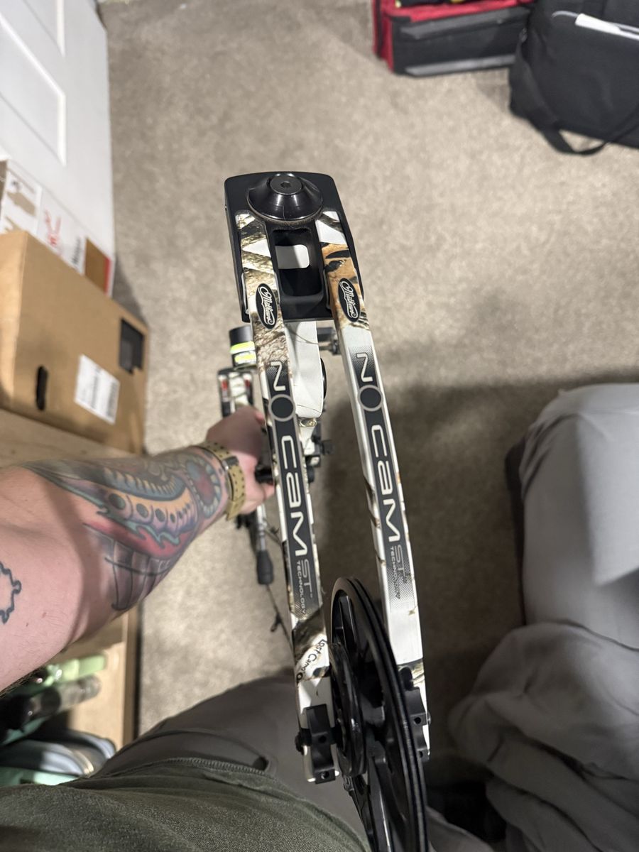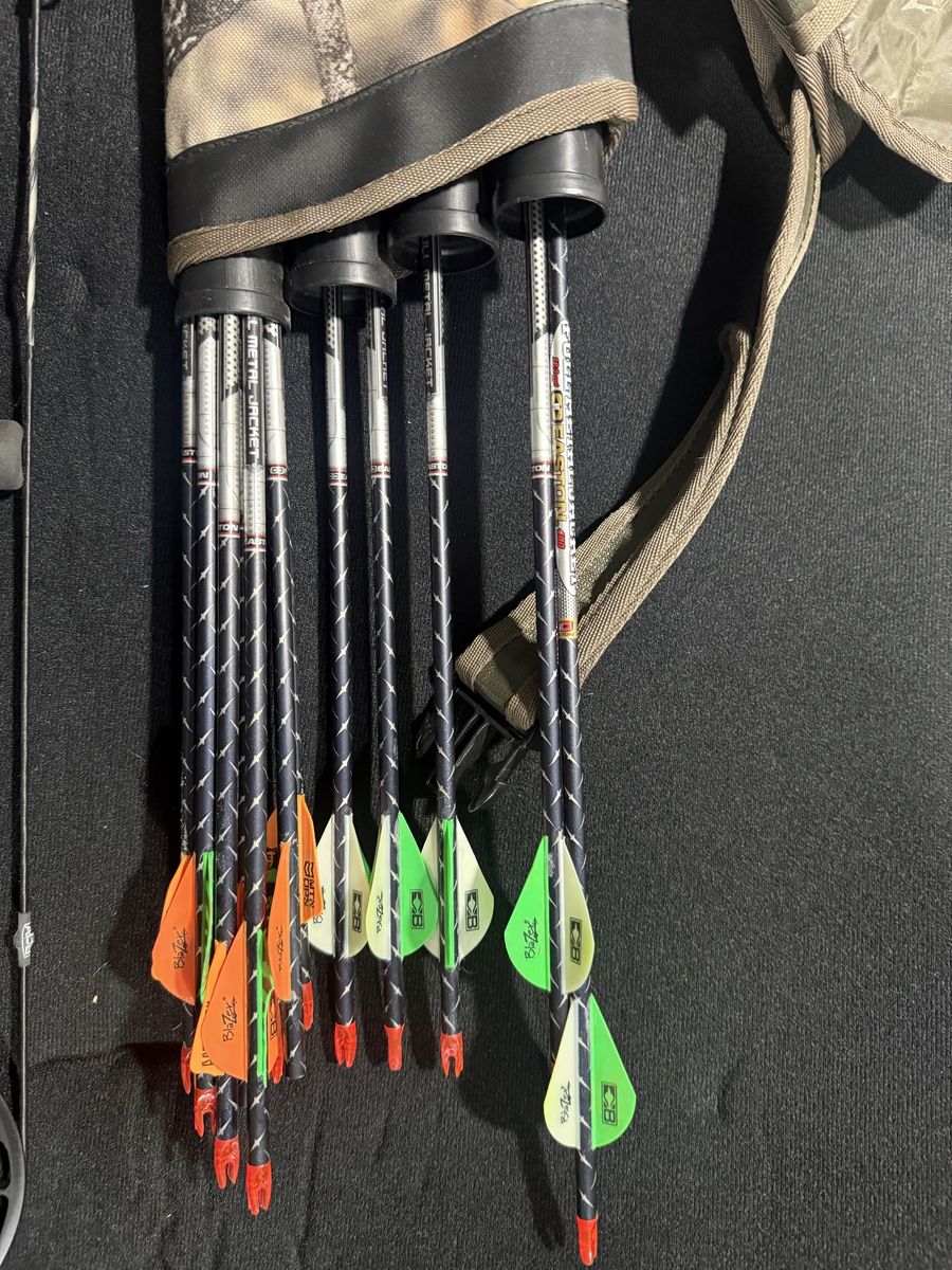 Matthews no cam bow, dampener , Easton hip quiver, 15 Easton full metal jacket arrows some are missing fletching, wrist strap trigger release and tension finger release. 700 obo