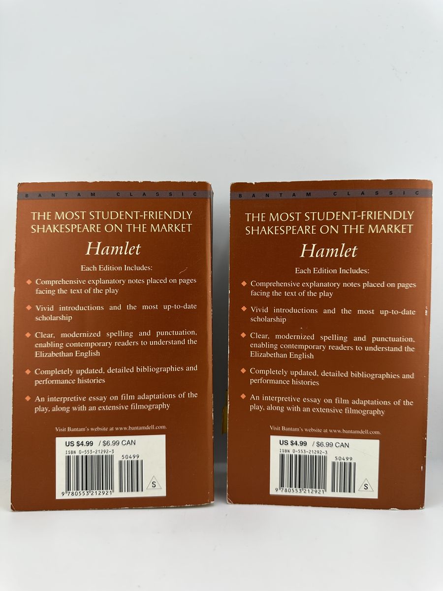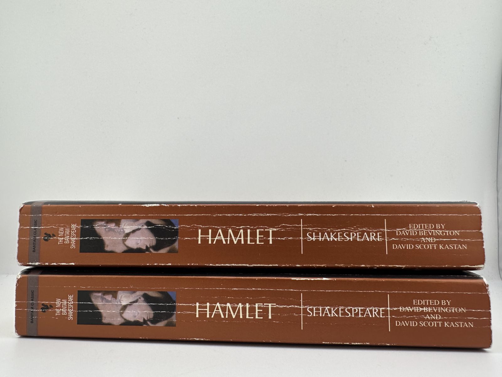 ApplePayLot of 2 Bantam Classic editions of Hamlet by William Shakespeare, edited by David Bevington and David Scott Kastan. These annotated student-friendly editions include detailed notes, introductions, and modernized text for easier understanding. Ideal for students, literature enthusiasts, or collectors of Shakespeare works. Books show heavy wear but remain complete and readable.
