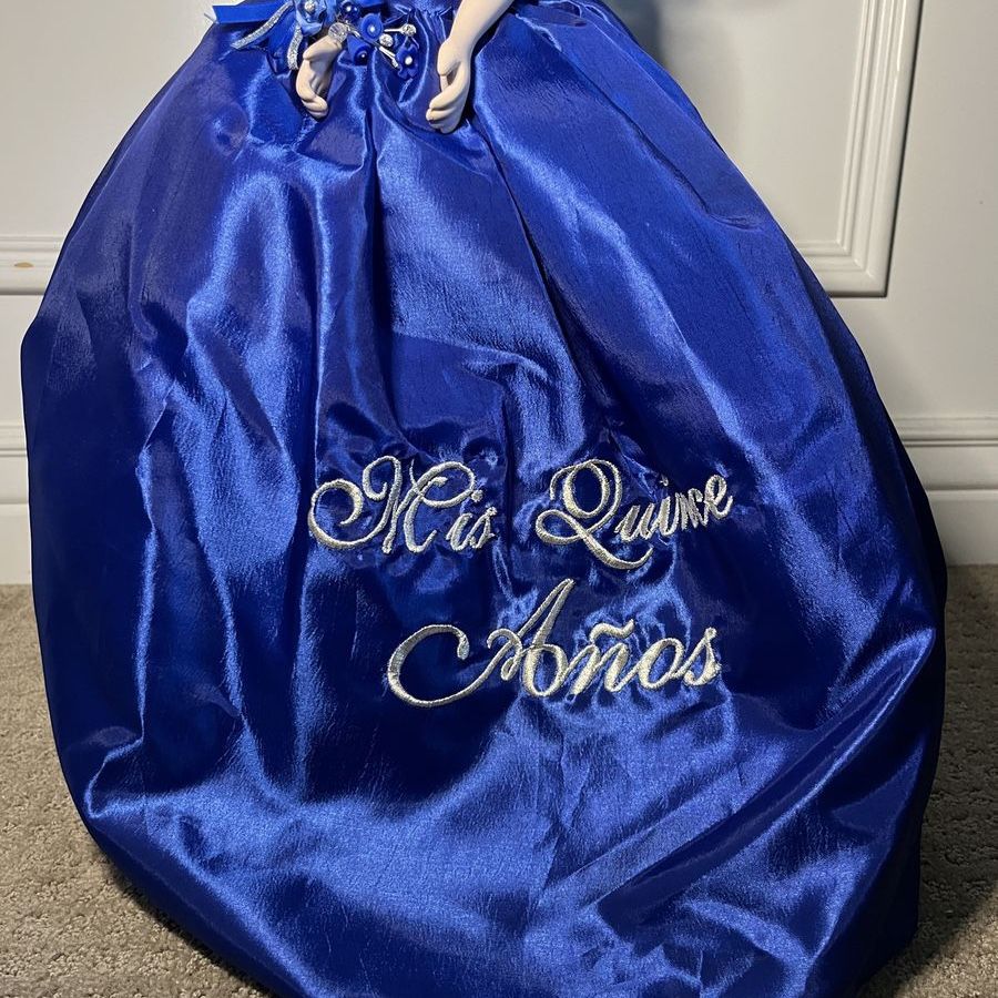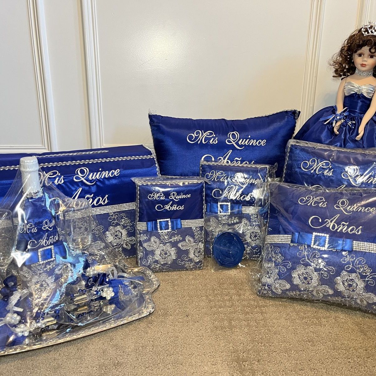 Full Royal blue quinceañera set which includes Pillows, copas, chest, bible, doll, (see pictures)