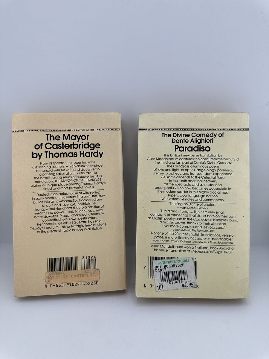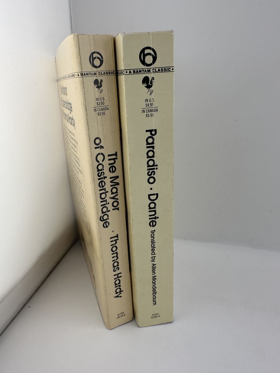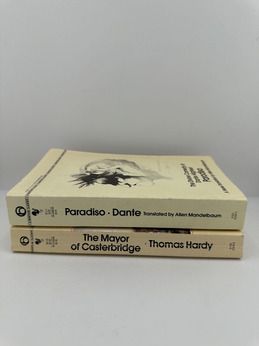 ApplePayVintage Bantam Classics lot featuring Paradiso by Dante (translated by Allen Mandelbaum) and The Mayor of Casterbridge by Thomas Hardy. These classic paperback editions show general wear but remain fully readable. Great additions for collectors, students, or anyone building a classic literature library.