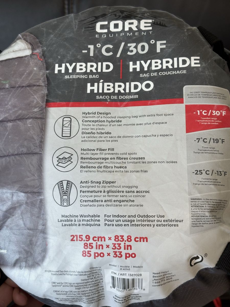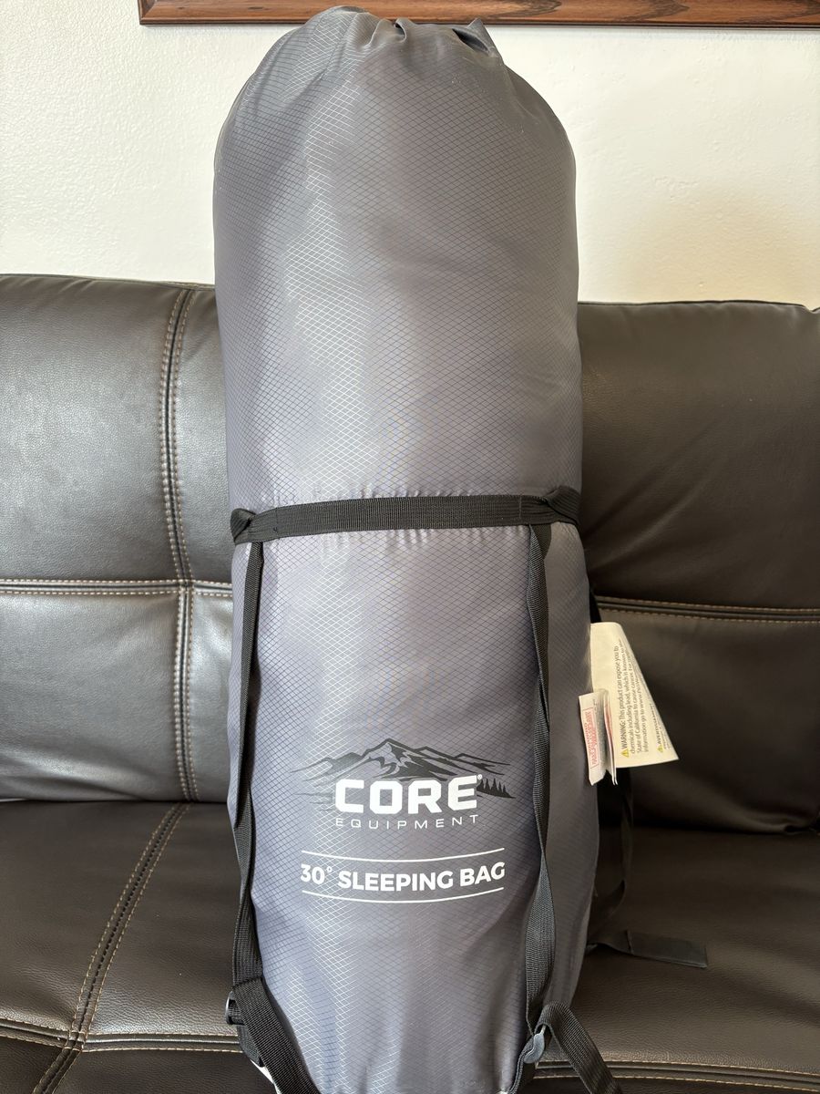 VenmoCore equipment 30 degree sleeping bag. Great condition. It’s a hybrid sleeping bag that gives you the warmth of a hooded sleeping bag with extra foot space. The hollow fiber fill prevents cold spots. And the anti-snag zipper is designed to zip without snagging.. Cash or Venmo.