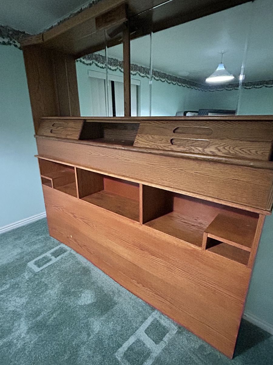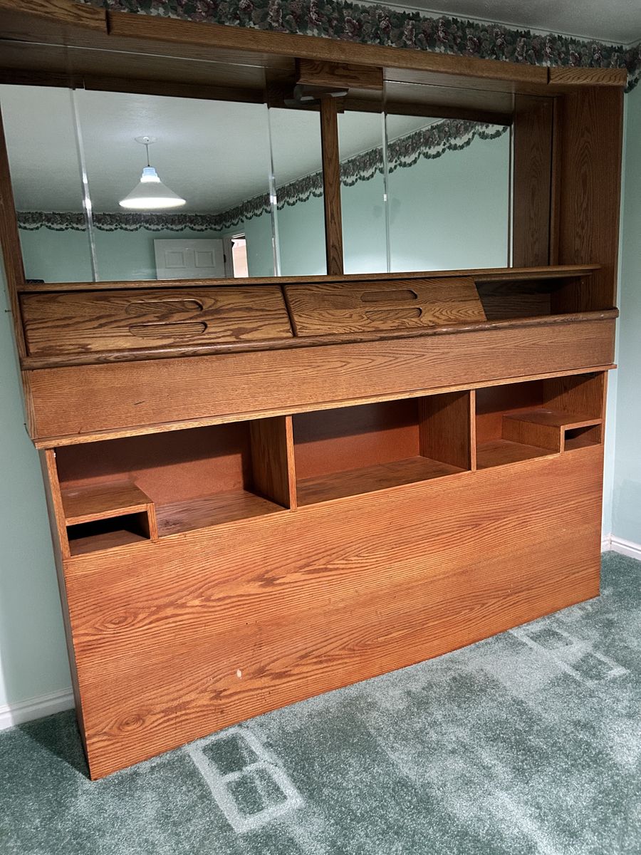Full Wall Headboard And beveled Mirror w/Close-by at hand Storage for books, water, Kleenex, clock radio or stereo, and nick-nacks. Mid-century-modern MCM. Measurements: 83” wide X 13.5” deep X 80” tall. Comes apart into 2 pieces- but it’s heavy and will need 2 strong people to move it.