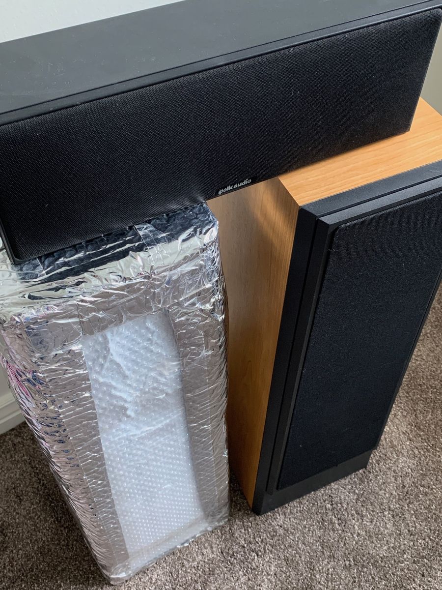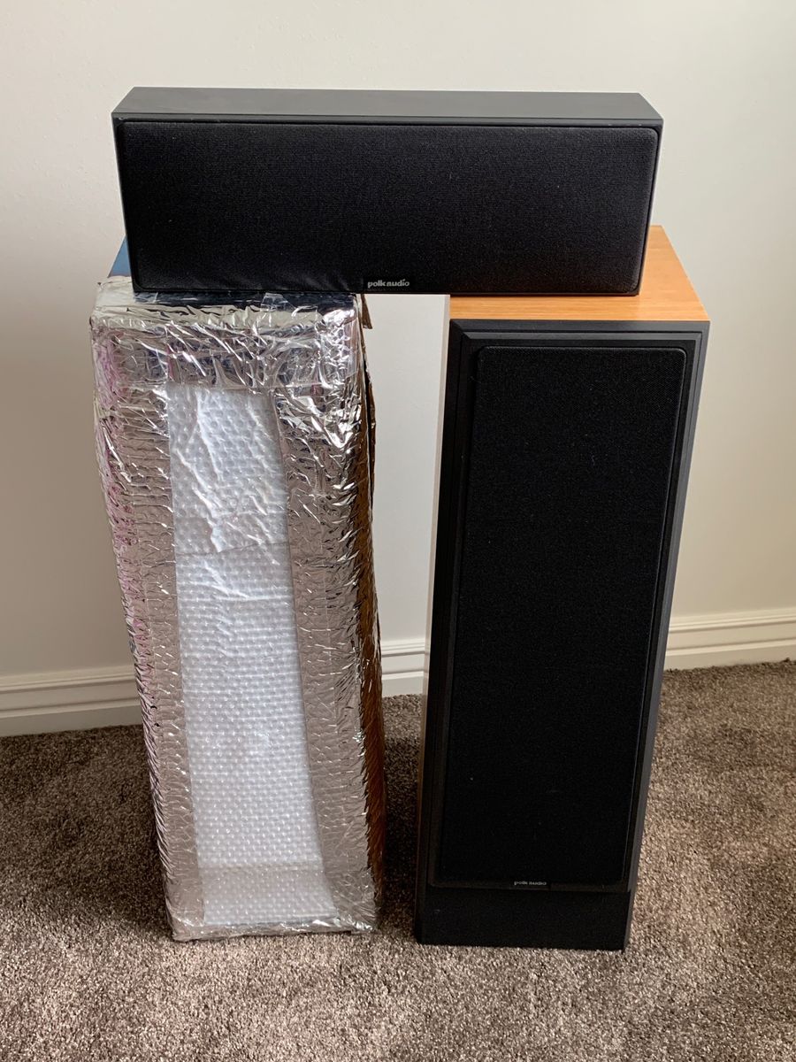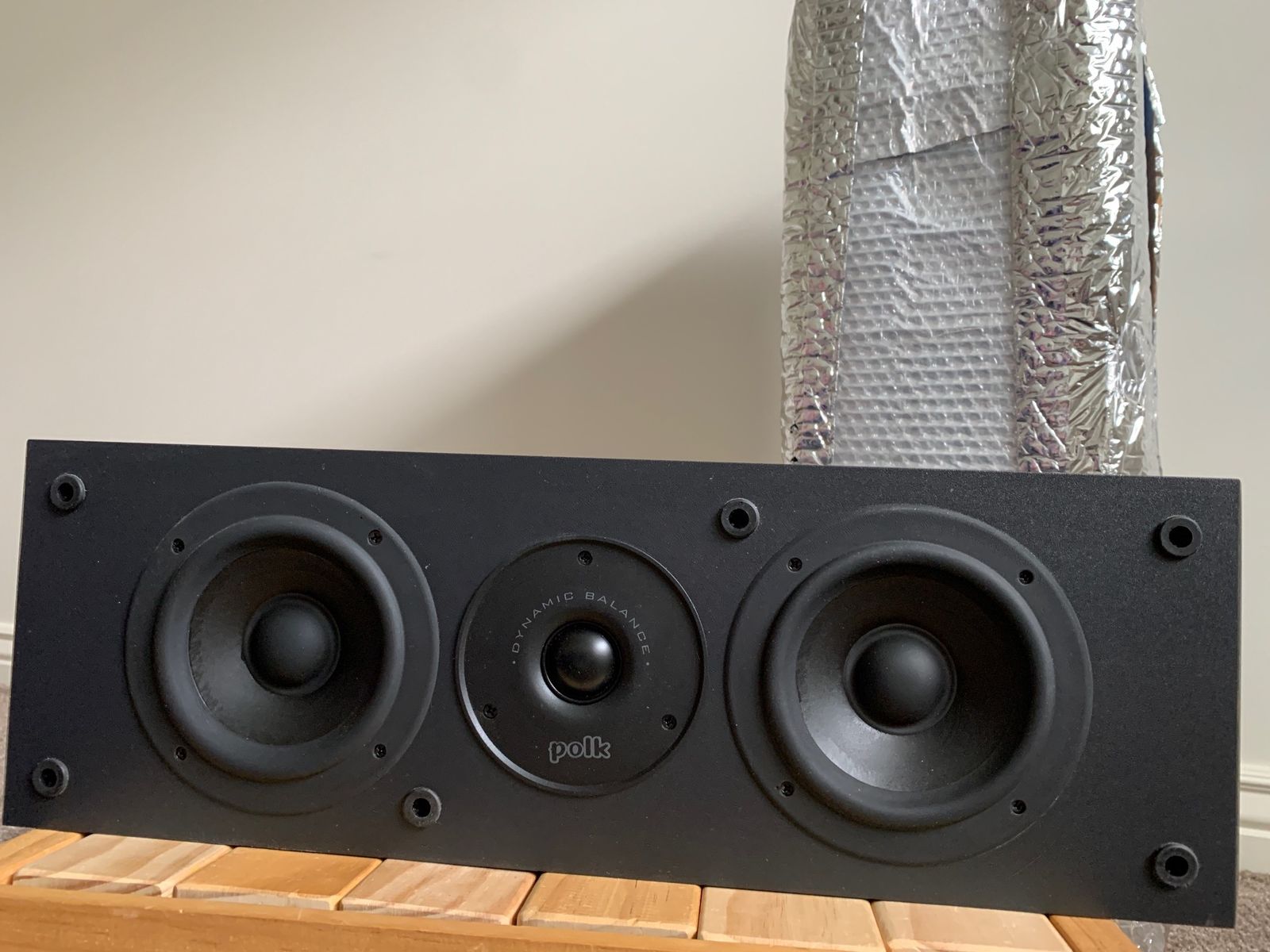 Polk CS250-S center speaker. 1 x1" dome tweeter and 2x 4-1/2" midrange/woofers. Size 6" H x 18" W x 8" D.