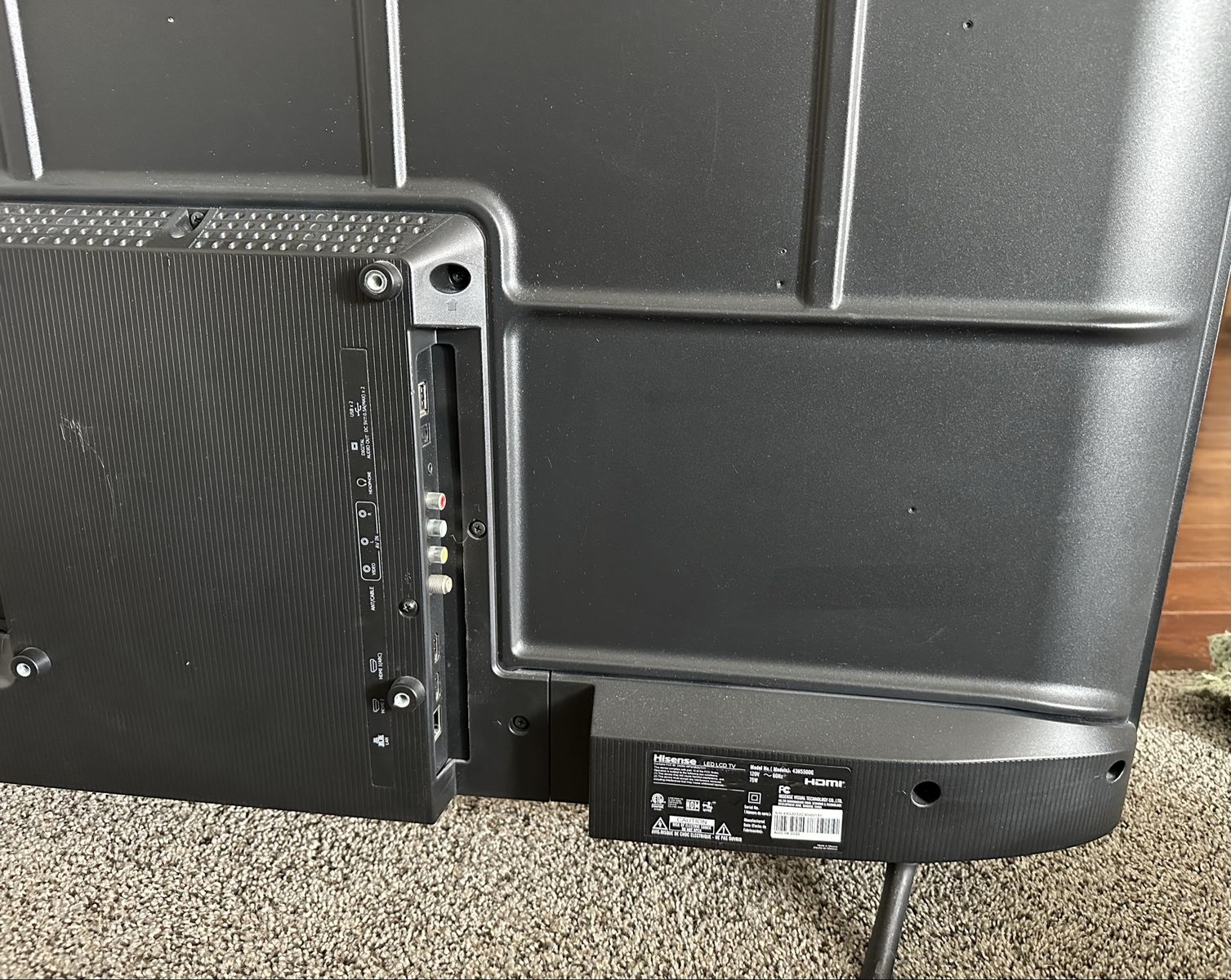 PayPalHisense 43" Android TV, featuring Chromecast built-in, DTS Studio Sound, 2 HDMI inputs, 2 USB ports, Ethernet, Wi-Fi, and Bluetooth. Google Assistant built-in. Dimensions (with stand): Approximately 37.6"W x 23.9"H x 7.2"D.