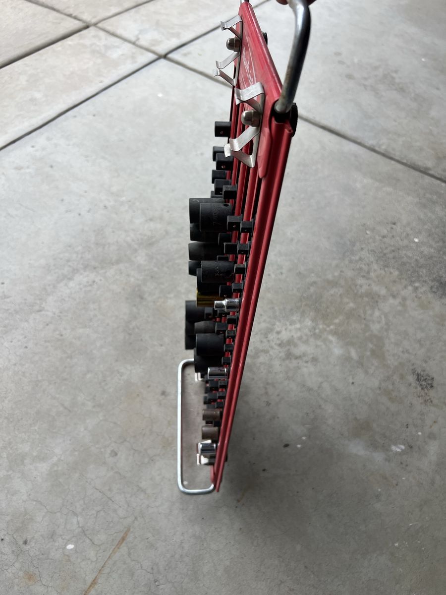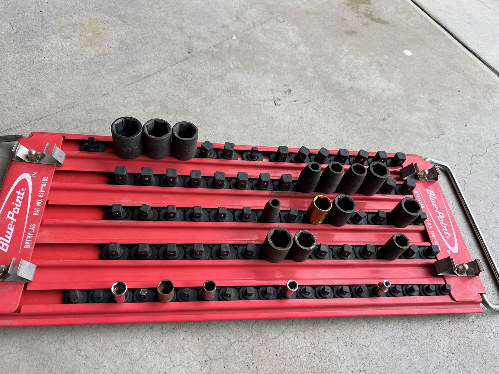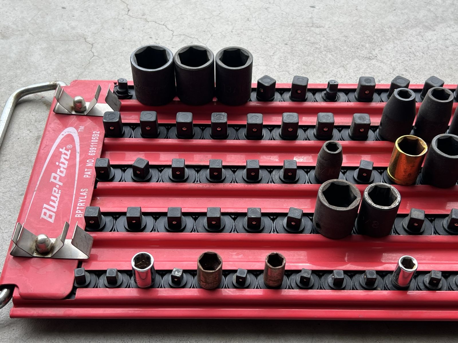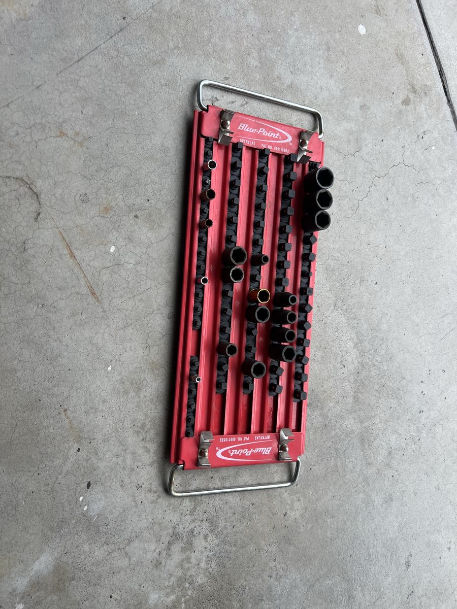This is a Blue Point (SnapOn) 1/4”, 3/8”, 1/2” Locking Socket Organizing Tray. In good condition, no dents. A few of the sliding socket locking things could be oiled so they slide easier.