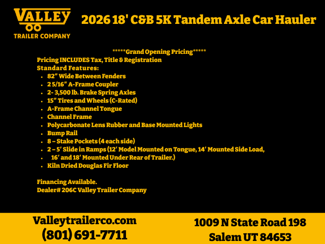 Standard Features:82″ Wide Between Fenders2 5/16″ A-Frame Coupler2- 3,500 lb. Brake Spring Axles15″ Tires and Wheels (C-Rated)A-Frame Channel TongueChannel FramePolycarbonate Lens Rubber and Base Mounted LightsBump Rail8 – Stake Pockets (4 each side)2 – 5′ Slide in Ramps (12′ Model Mounted on Tongue, 14′ Mounted Side Load, 16′ and 18′ Mounted Under Rear of Trailer.)Kiln Dried Douglas Fir Floor