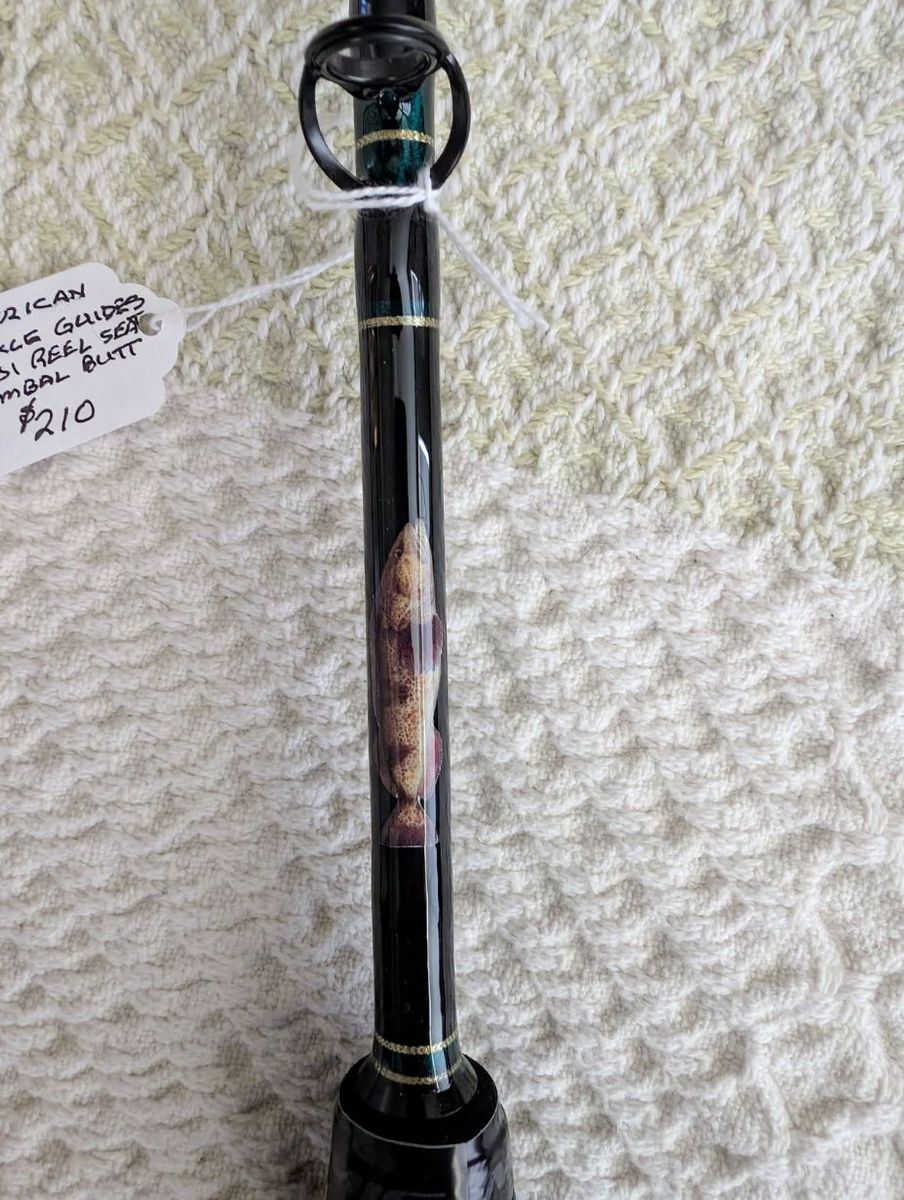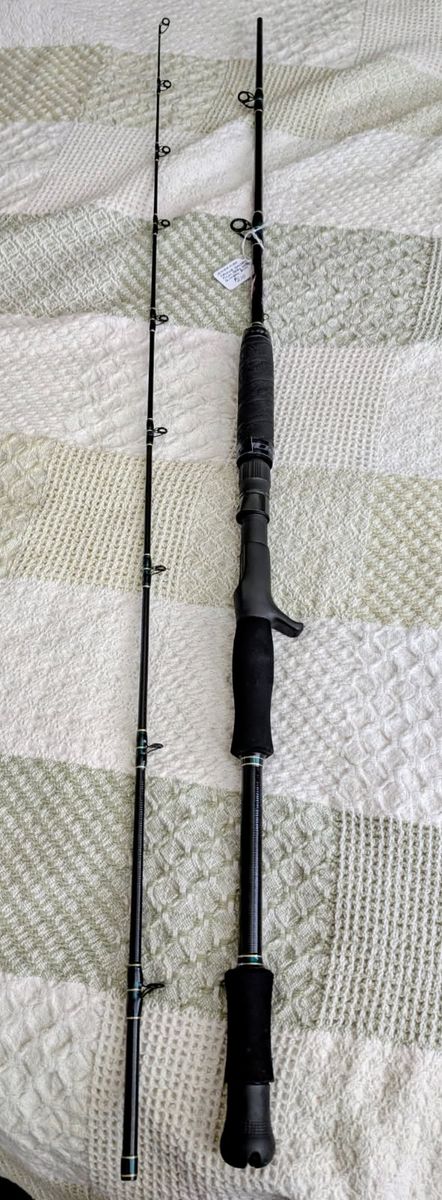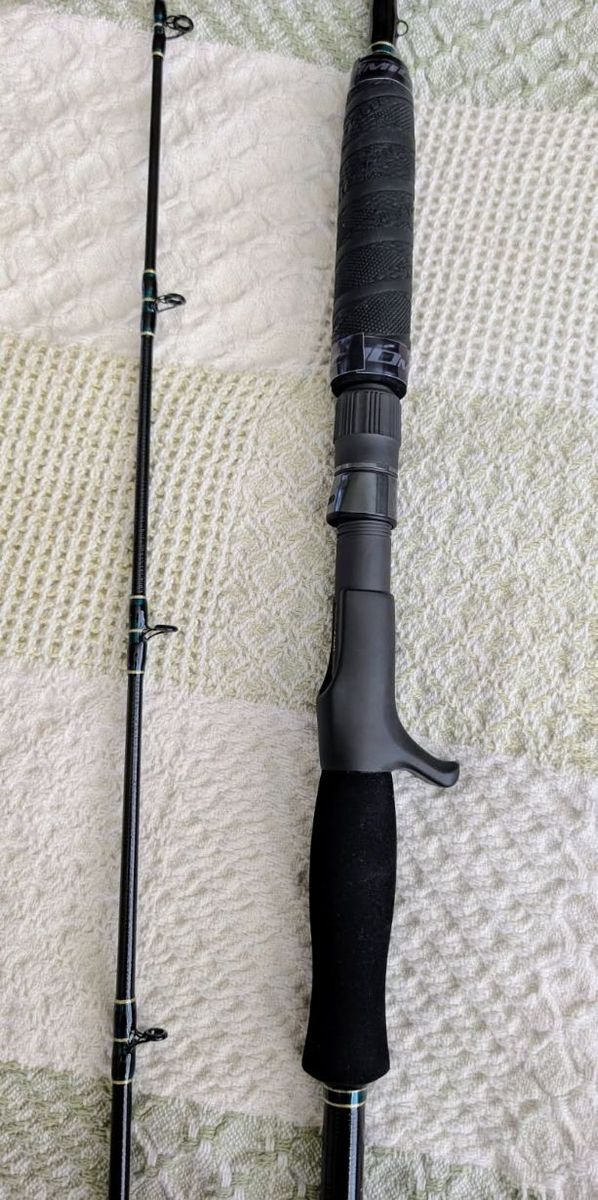 New, custom 2-piece saltwater casting rod. I have constructed this rod from a USA-made Stryker LSW763-2 blank (rated Med. fast, 20-40#, 1-6oz. lure) with black American Tackle guides and tiptop. The blank is a beautiful gloss black and the guides are wrapped in metallic green and black thread with metallic gold accents. The rod has a premium Fuji palming reel seat with hard EVA grips and a Fuji gimbal butt. The foregrip has been wrapped in IOMIC grip tape which can be removed for cleaning and then reapplied. This rod is perfect for a variety of light salt water applications like bottom fishing for snapper, rock fish, ling cod, yellowtail, white sea bass, etc.