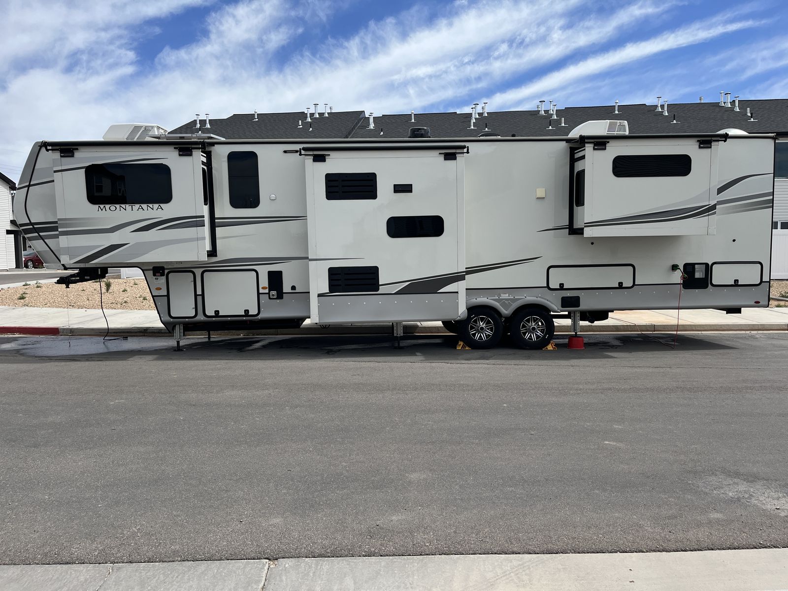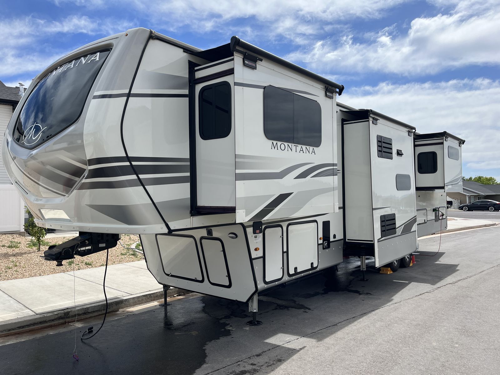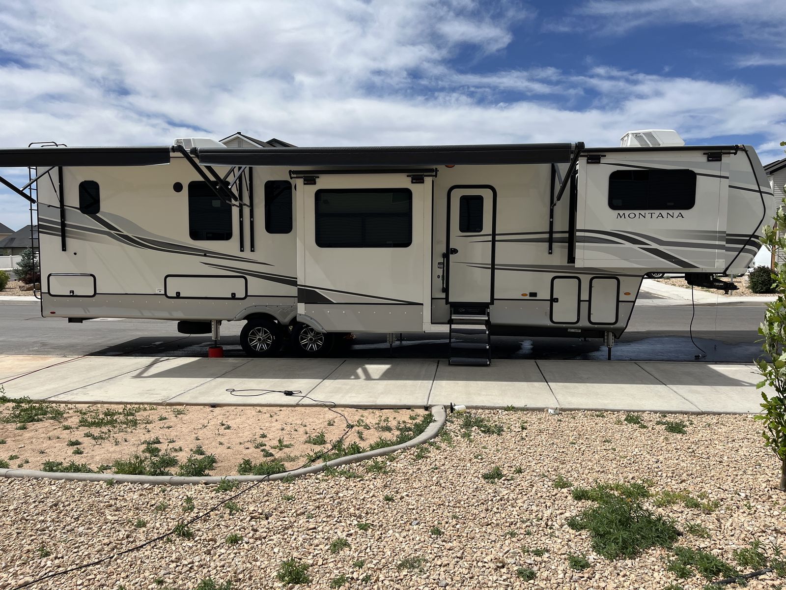 This is a 2022 Keystone Montana 3761FL in better than new shape with all the inevitable manufacturer kinks worked out already! Upgrades inlcude slide covers on all 5 slide, washer, dryer, custome dining table and bench w/storage, custom dinette/office space, and includedes a full winter side-skirt setup. We just took out the shower doors and added a curved shower curtain rod to give more room in the shower too! The mattress is like new, was only used a few times before we used a different one.