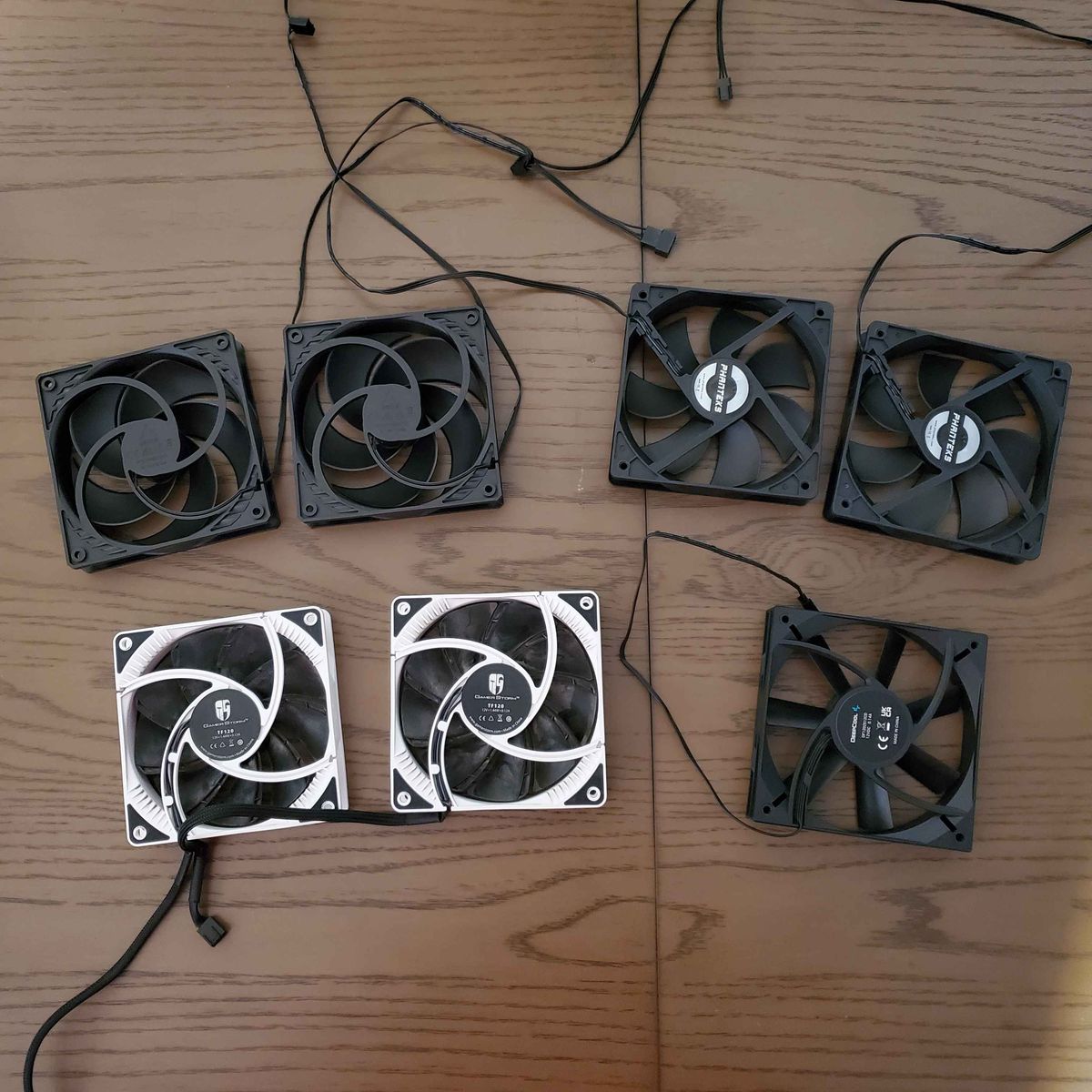 VenmoVarious 120mm PC fans mostly new & unused. The Arctic P12s are leftovers from a build, the Phanteks and DeepCool are chassis fans that were replaced before they were ever used, and the white Gamer Storms are from an AIO and are used but still work fine. Arctic & Gamer Storm are 4 pin, Phanteks / DeepCool are 3-pin. No RGB features on any of them. Open to offers and let me know if you have any questions. Thanks for looking!