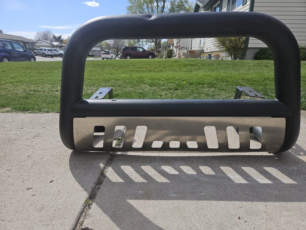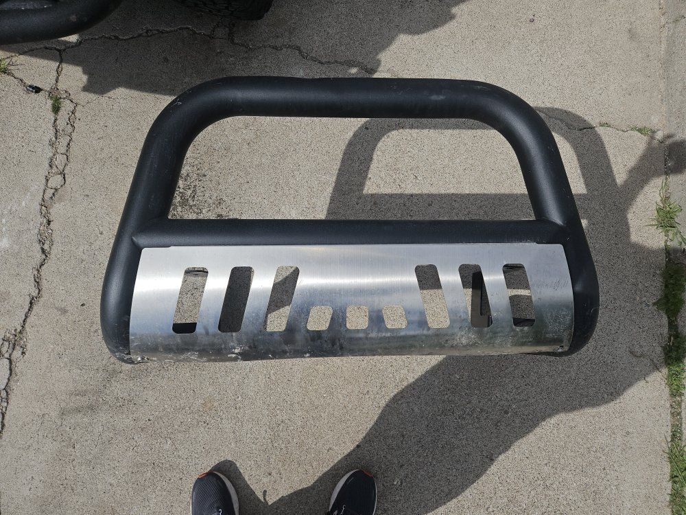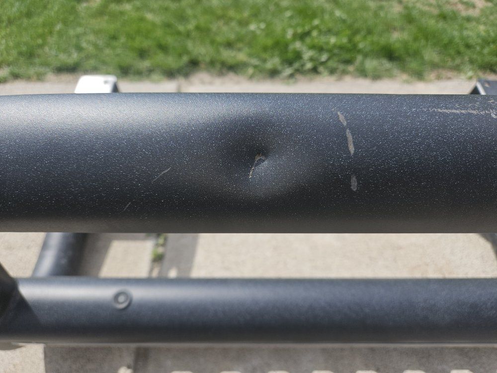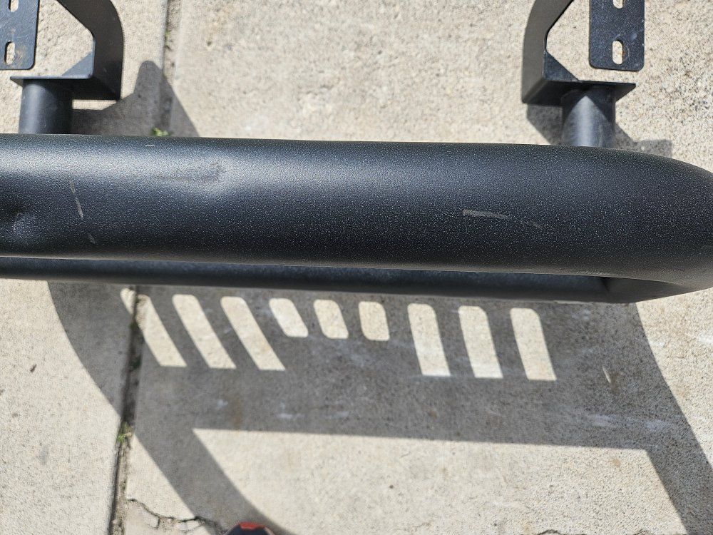 Has a small dent which is in the pictures. A couple of small spots missing a little bit of paint. Comes with the hardware may need 3 new washers. Not sure what brand it is.