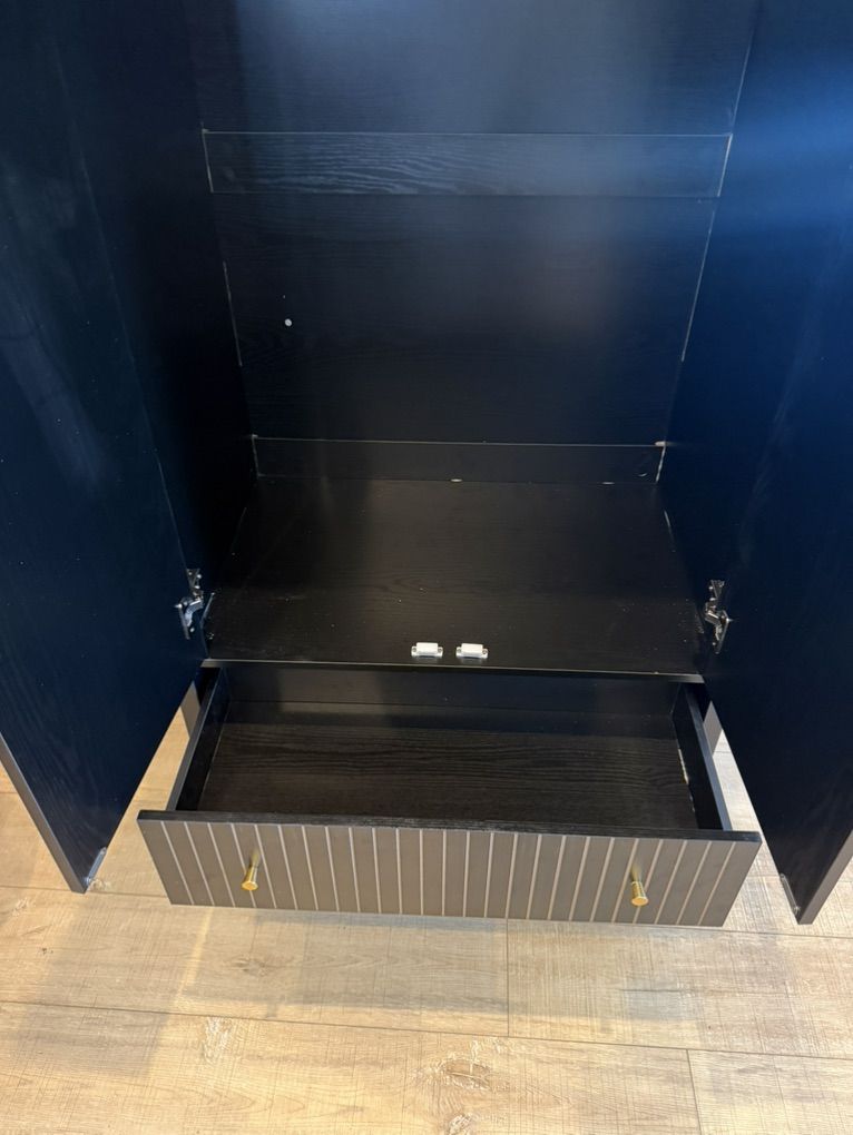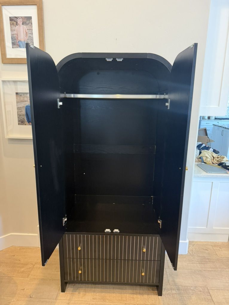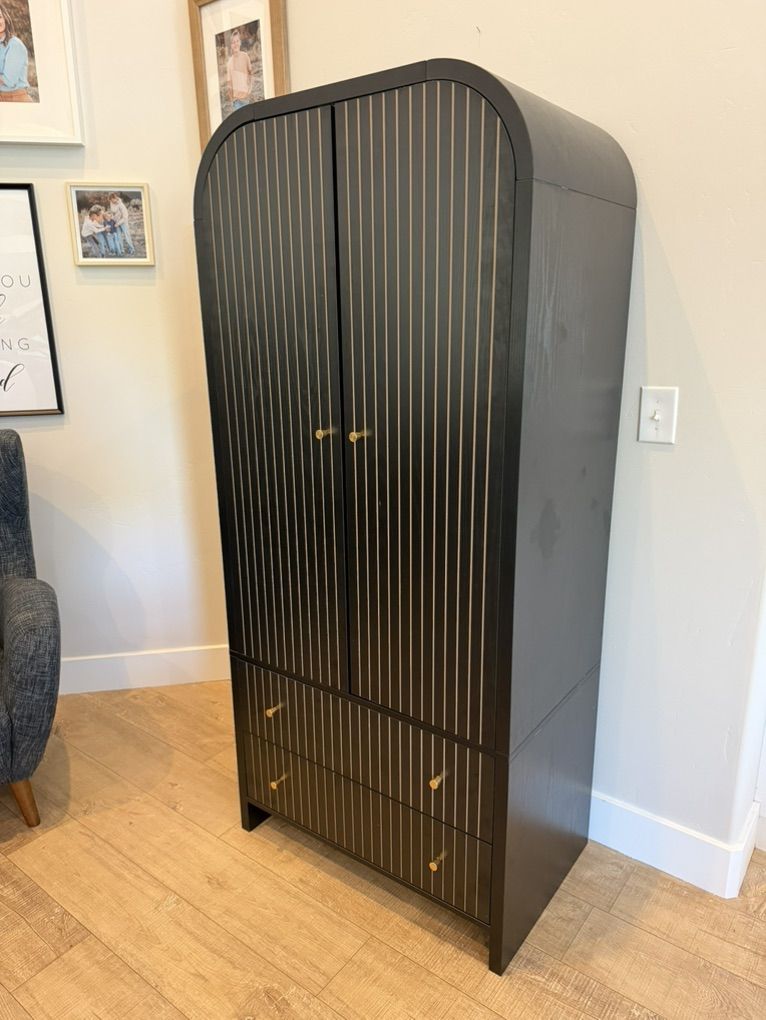 Gorgeous mid-century modern armoire with a high-end look (arched top + fluted detailing + brass hardware). This piece is solid, sturdy, and fully assembled—no wobble.