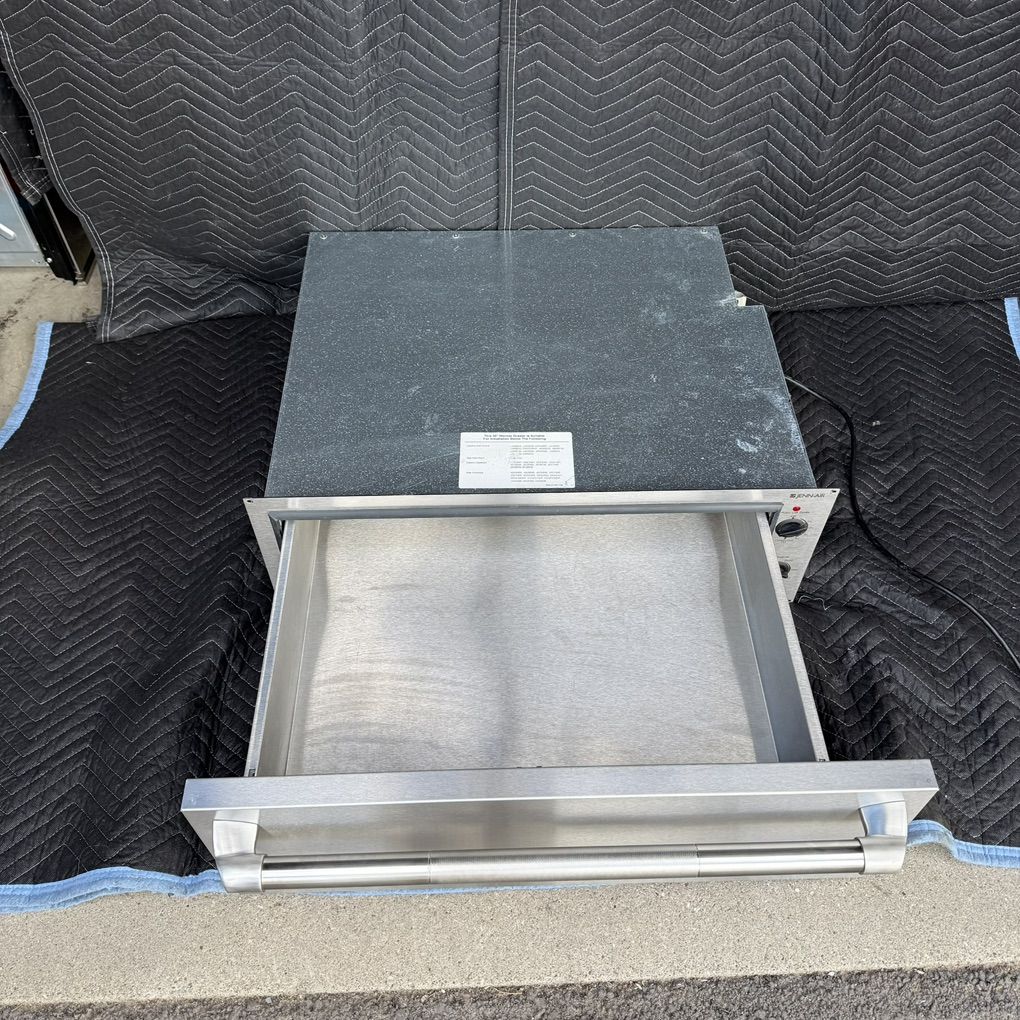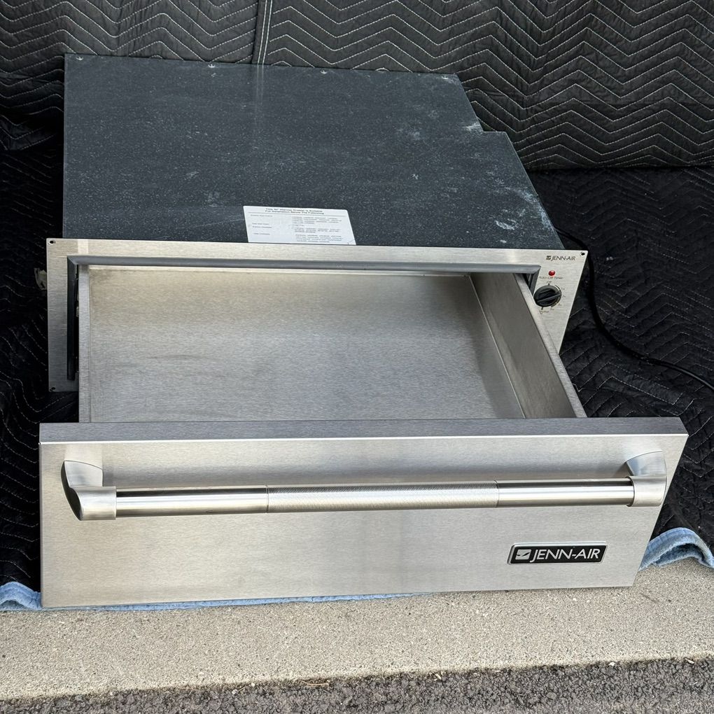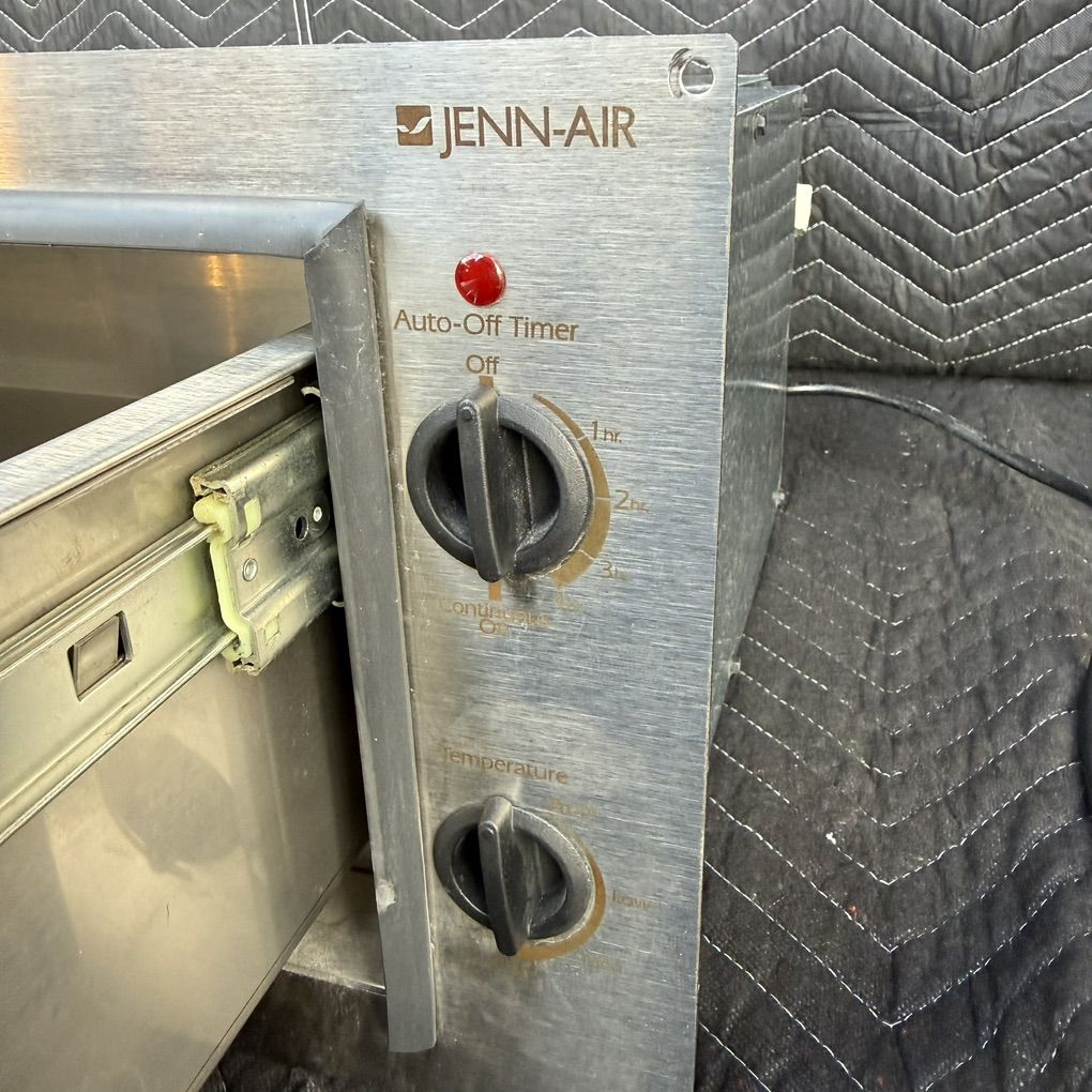 Used Jenn Air 30 Warming drawer, stainless steel temperature control. Model: JWD7030CDX. Serial: 10009595GV. Made in USA