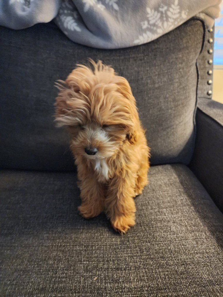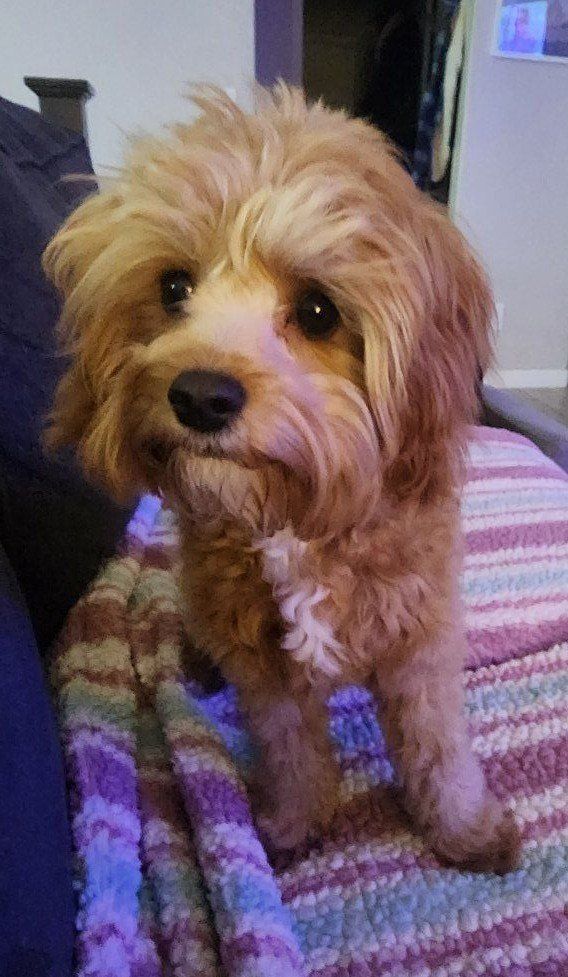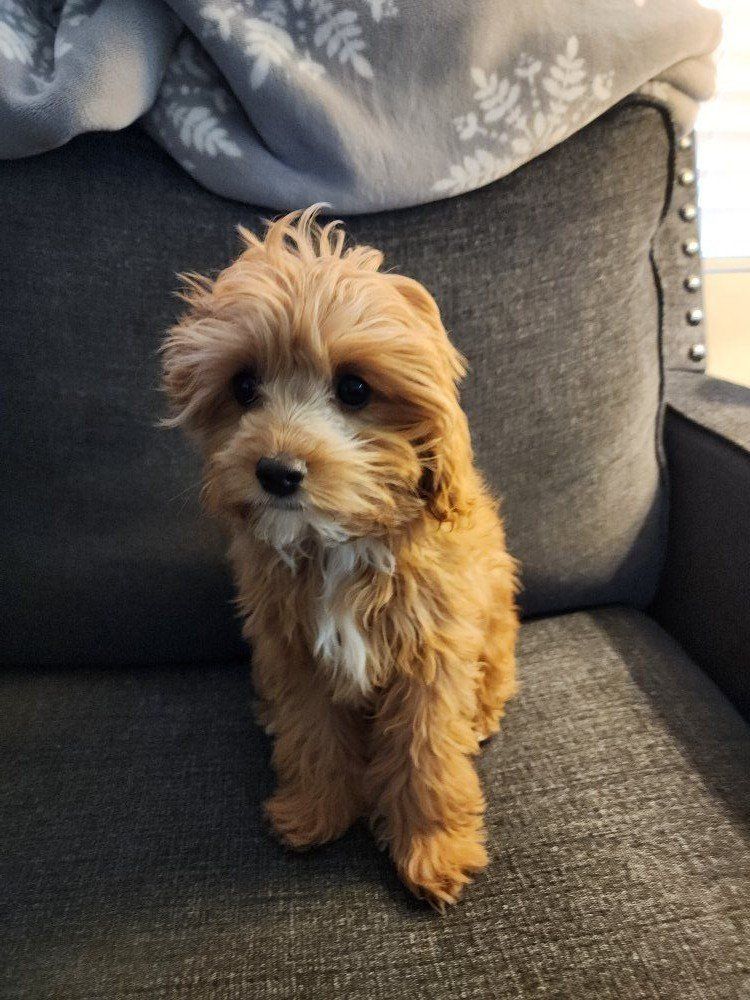 A beautiful 9‑month‑old puppy who has a wonderful temperament. She is 8 lbs. Probably will not get any bigger. Dad is a cavapoo. Mom is a poodle. She’s fully crate trained, sleeps through the night, and is at a great age for bonding and continued training. Microchipped