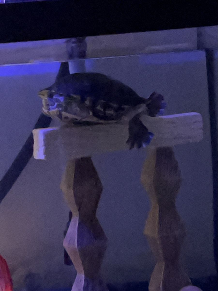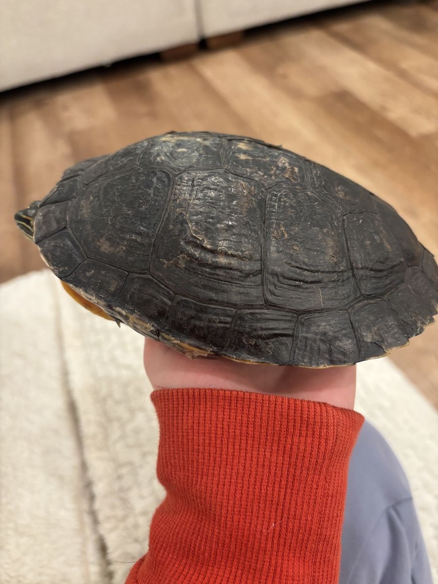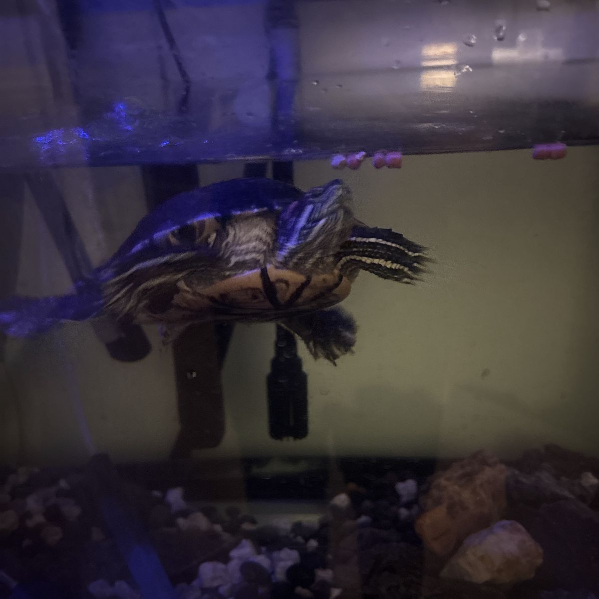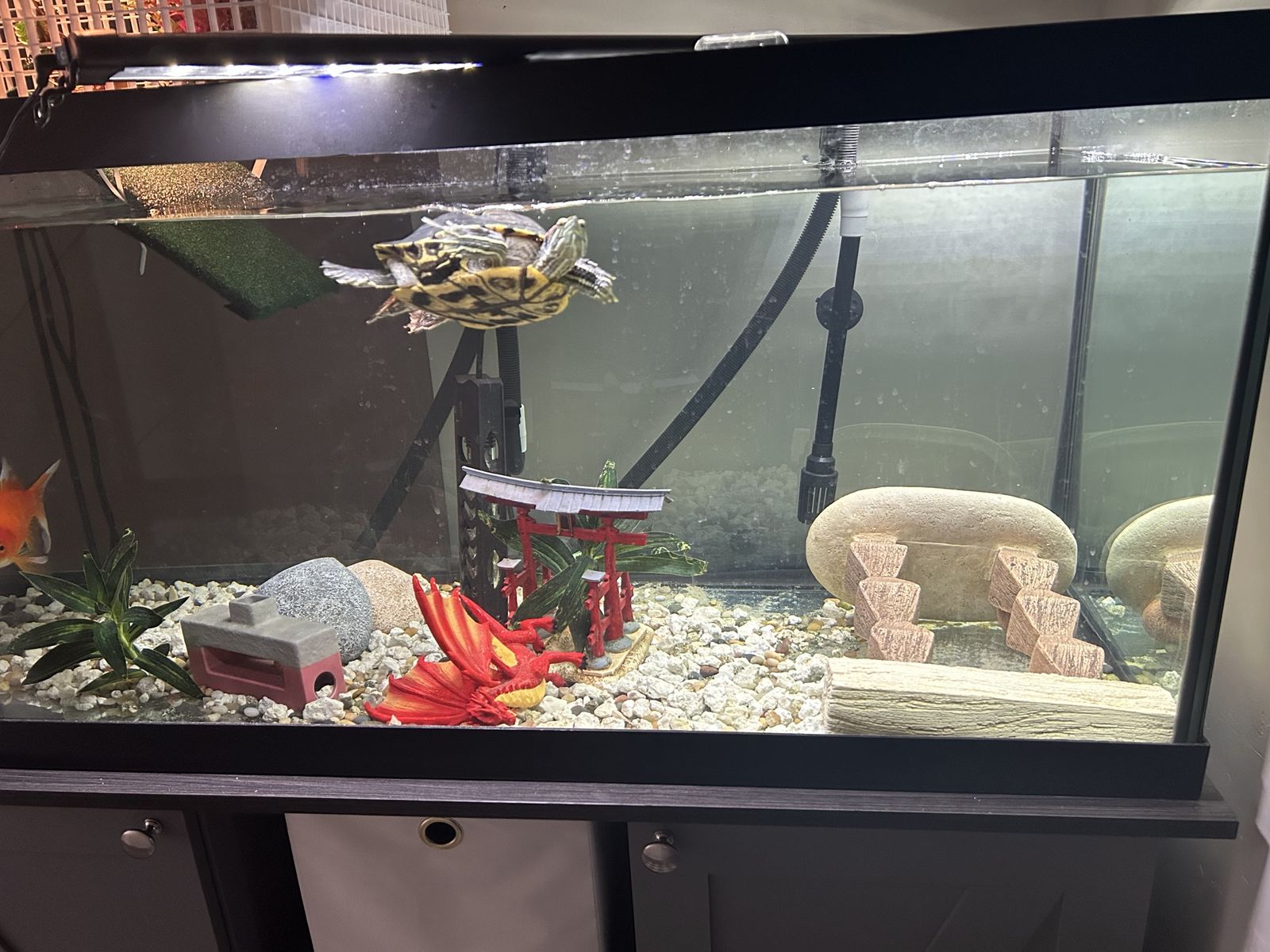 1 year worth of filter (fluval 407) cartridges 75 gallon tank and base Turtle food also! He enjoys shredded carrots (they’re his favorite) And blueberries He lived with a large goldfish for 3-4 years so I imagine he would do okay in a pond! His name is Sheldon.