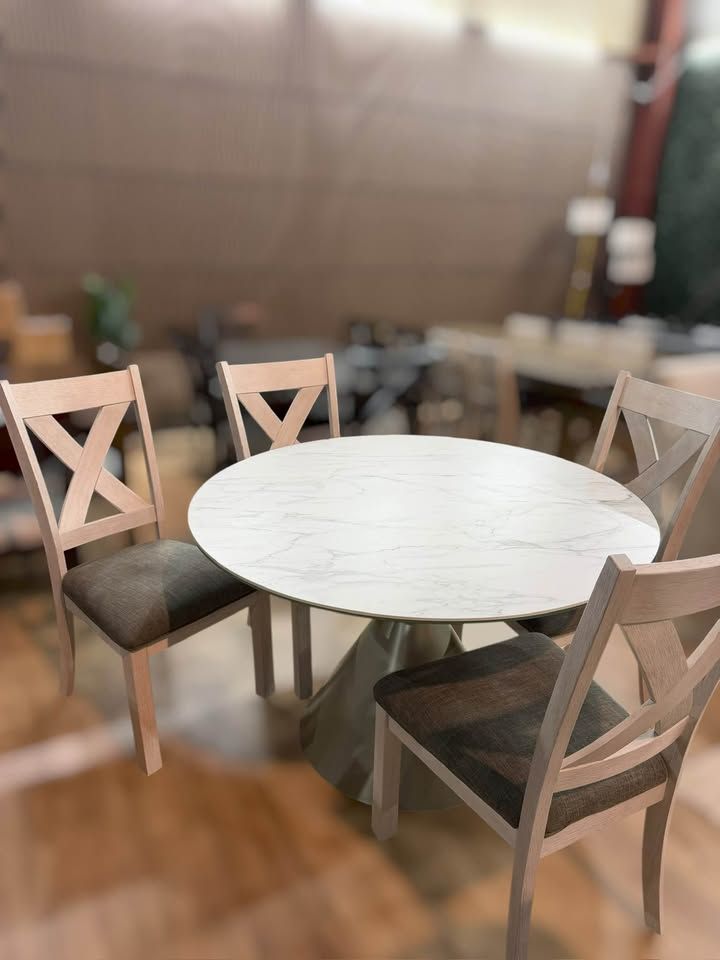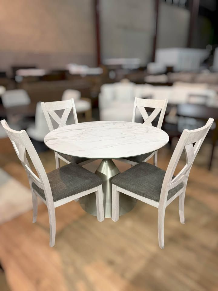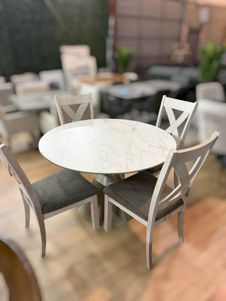 Why this set stands out Beautiful stone top finish Modern round design β great for conversation Elegant metal base (champagne tone) Includes 4 matching chairs Perfect size for dining areas or apartments