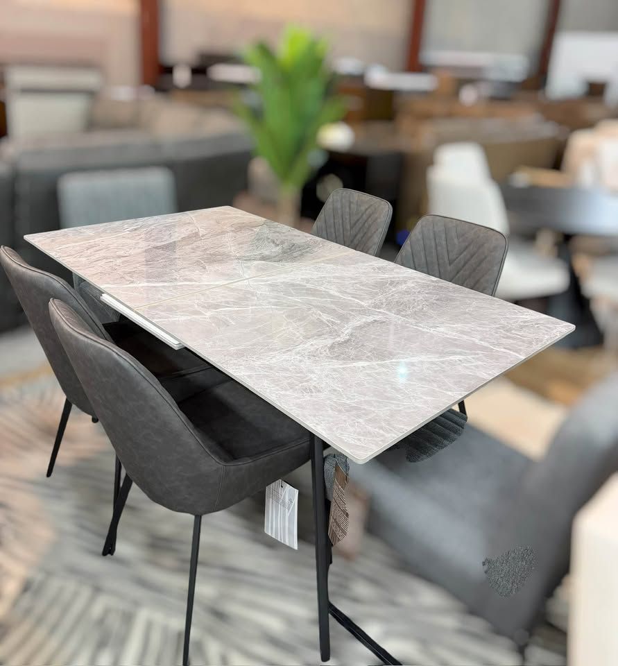 Why this set stands out Sintered stone top – heat, scratch & stain resistant Extendable table – more space when needed Strong metal base – sturdy & modern Comfortable upholstered chairs