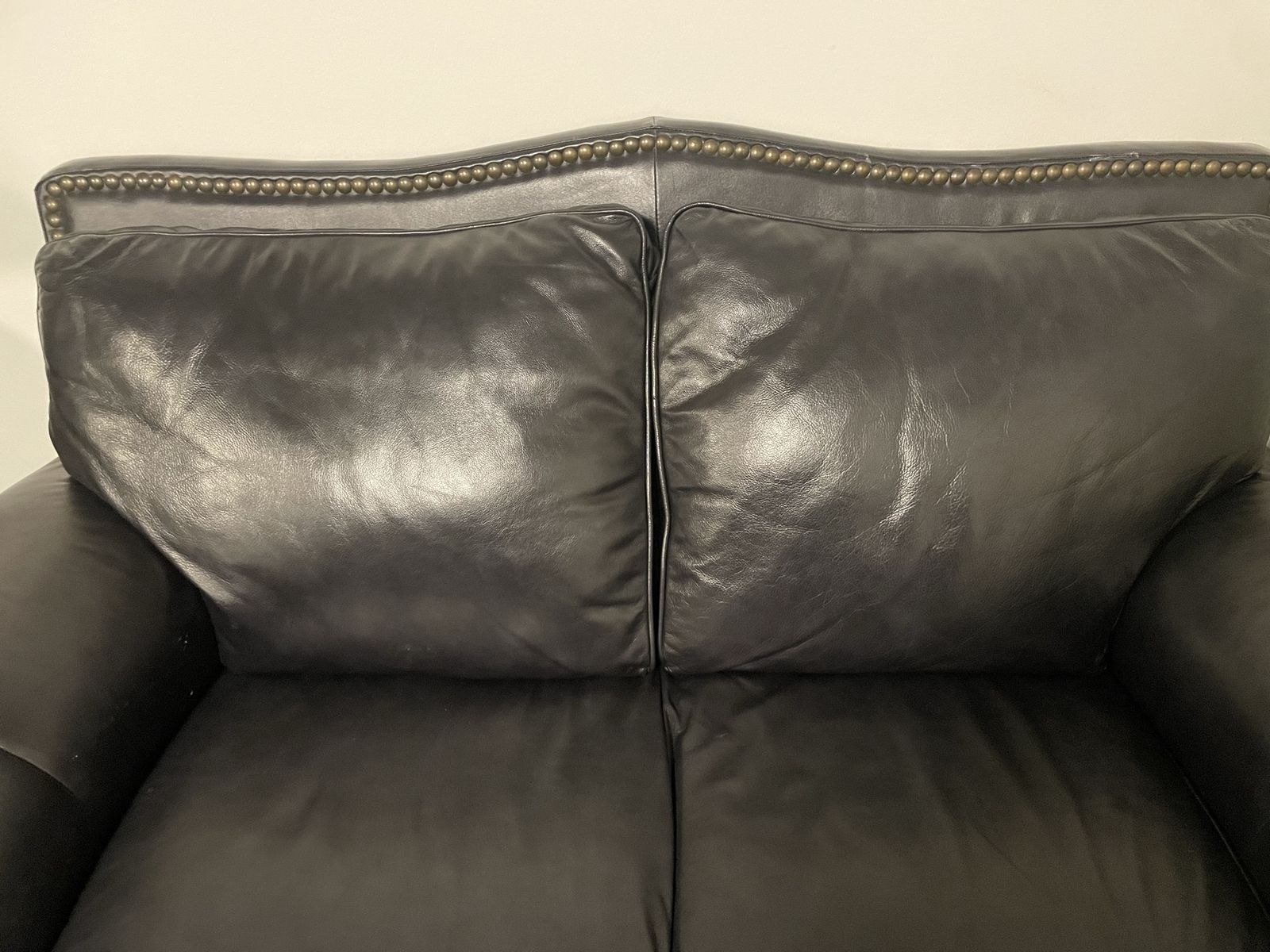 Super clean no cracks or spills. Extra couch and don’t need it anymore. It’s real leather, is a love seat. Super comfy. If you want more pictures let me know! It is dark black and has gold nailhead trimming