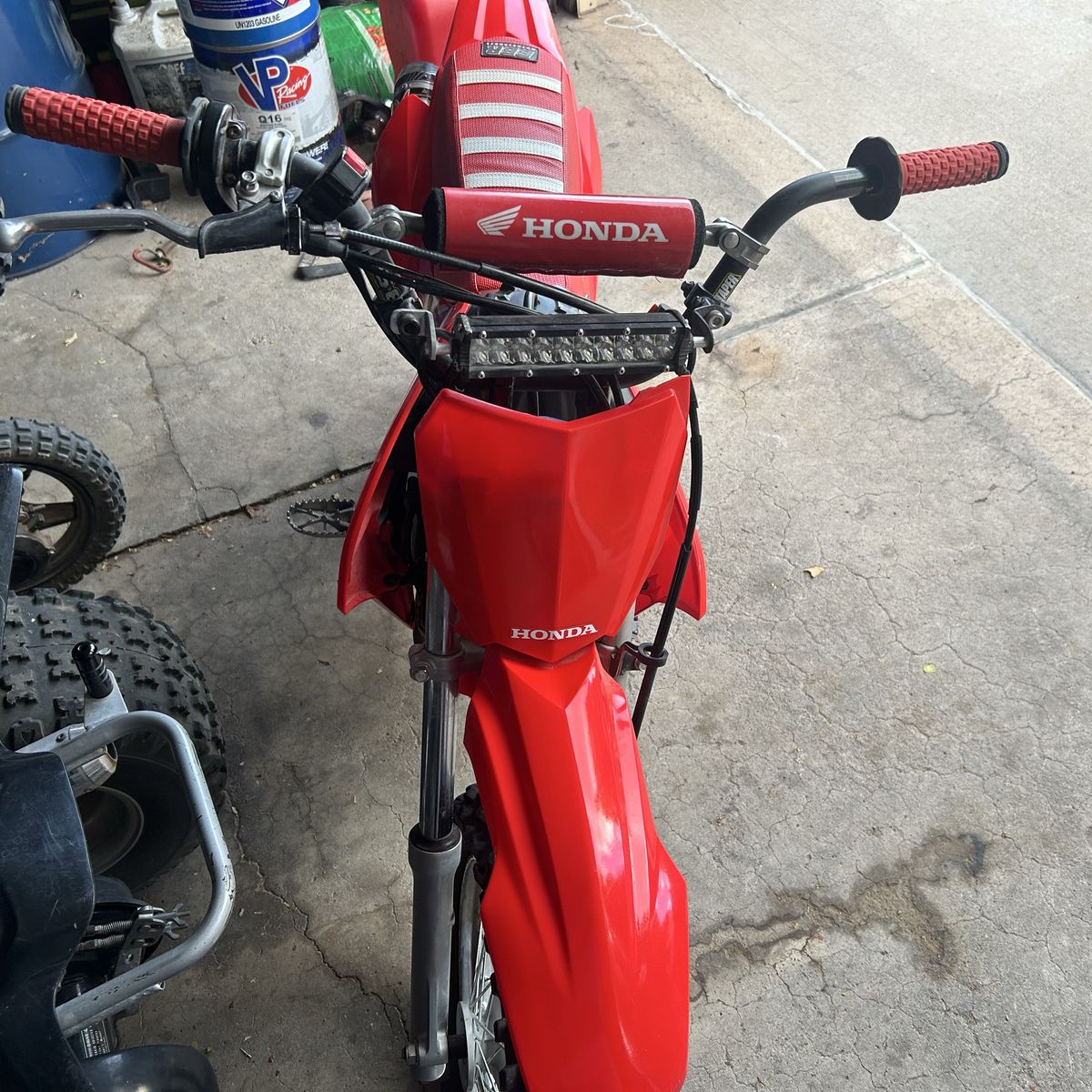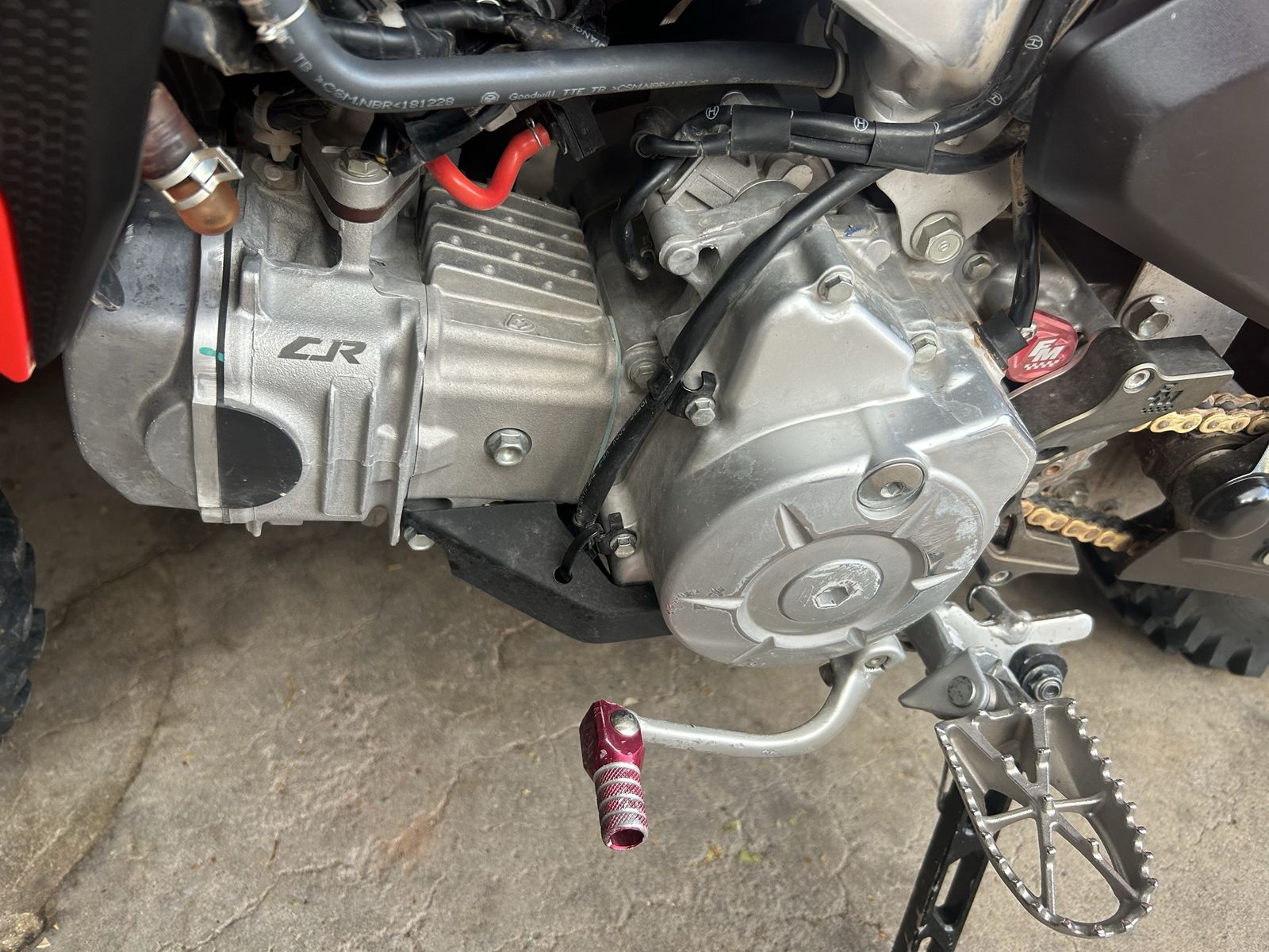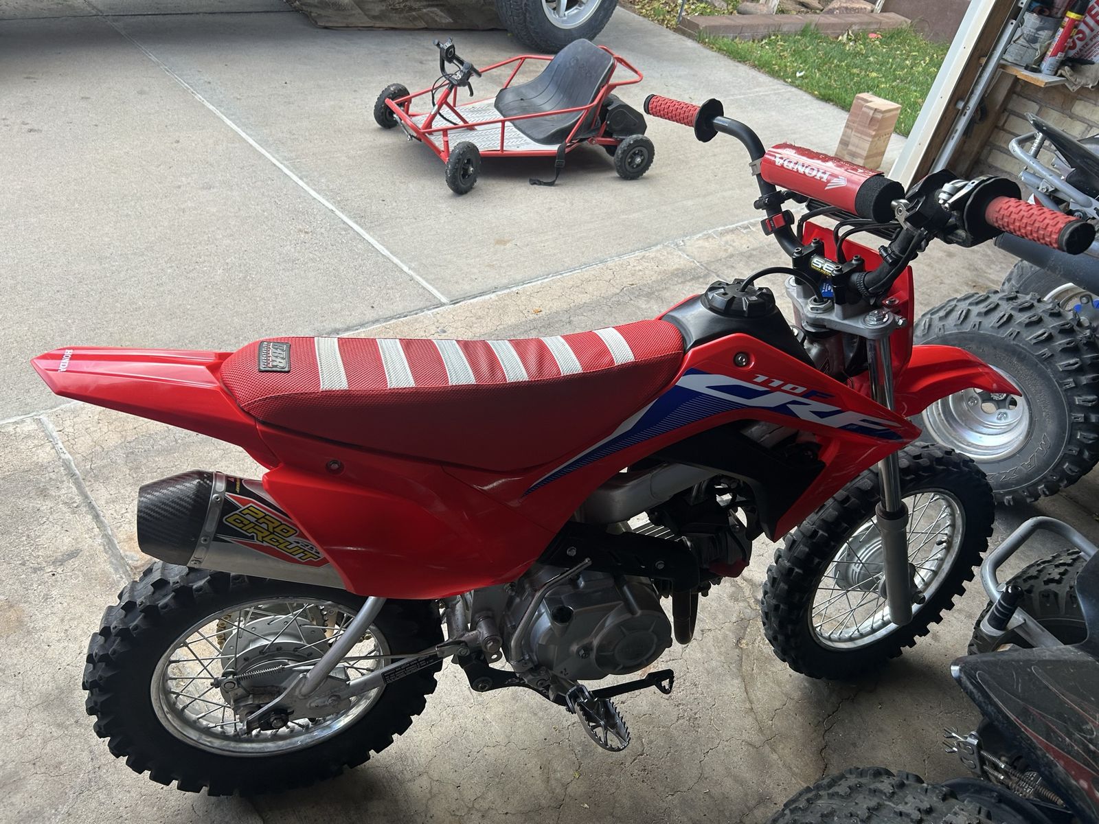 -tb billet throttle tube -pro taper xr50 bend bar -sik 110 rear brake pedal -oversized pegs. -2024 crf plastics\