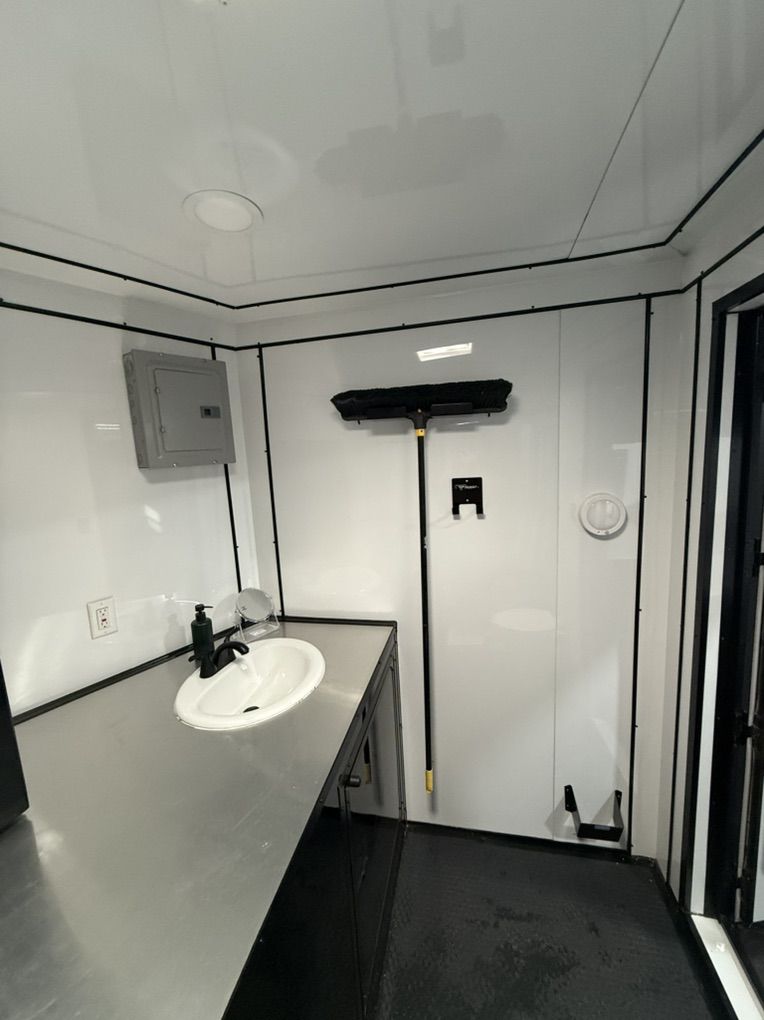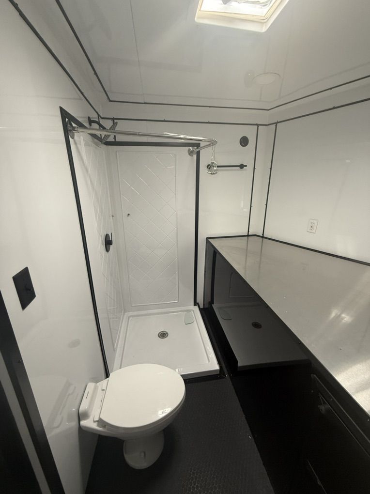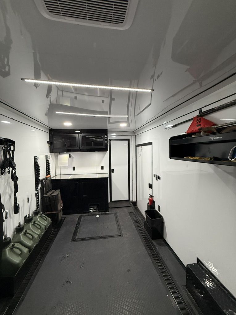 Full Bathroom w/ 3x3 Shower 15,000 BTU A/C w/ Heat Strip Refrigerator Helmet Storage Strap Hangers Gas Can Holders 12V LED Strip Lighting