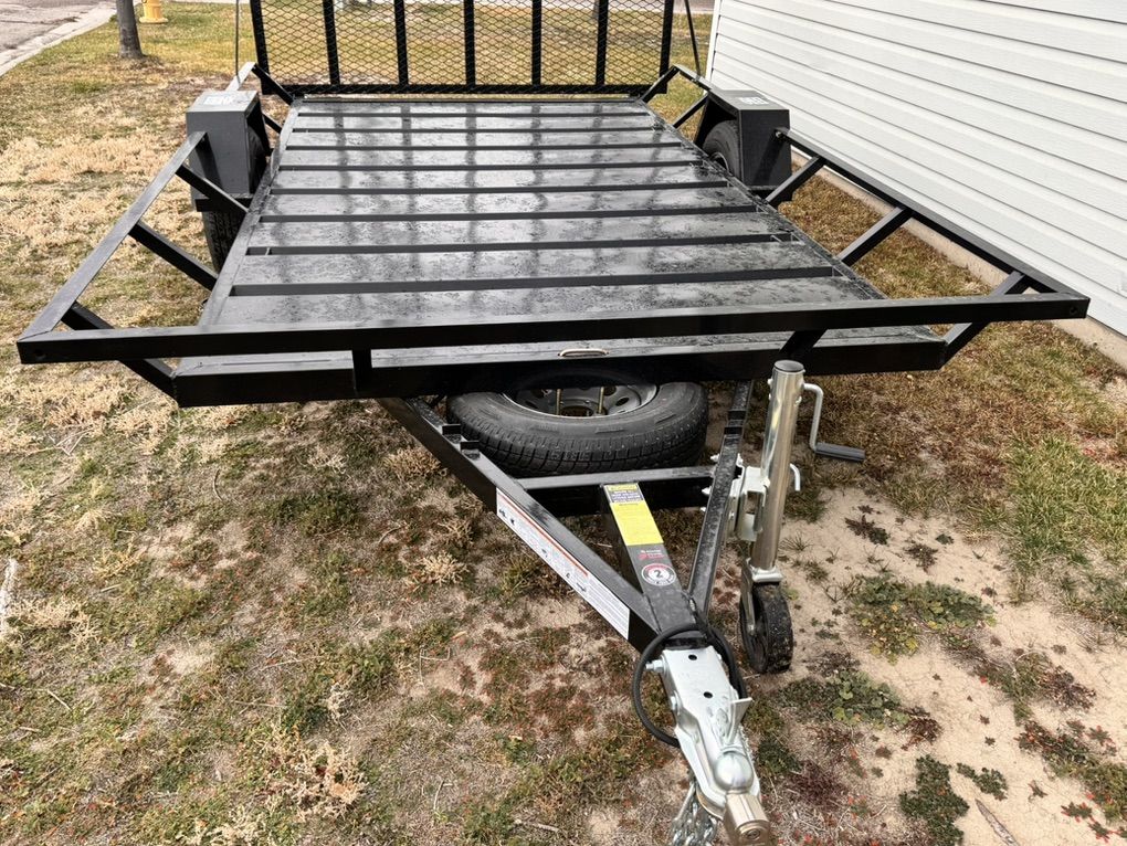 All metal 6’3” wide deck 11’ long Rear tailgate 3500 axle Radial 205/75/14 Tires Powder Coating Finish Safety chains 2” Ball hitch 4 Way electrical plug LED lights Spare tire