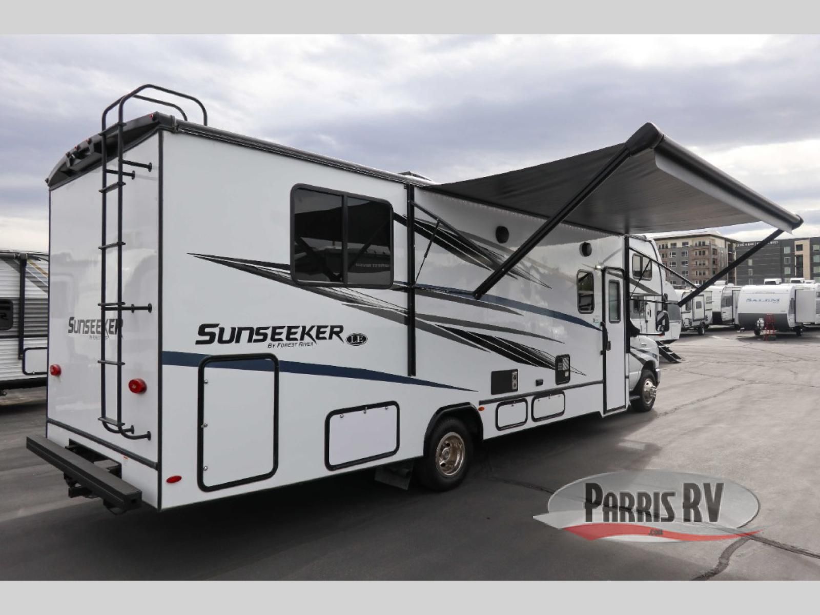 This Sunseeker LE Class C gas motorhome will allow you to travel to other states with your favorite people beside you! You can take a moment to enjoy a fresh cup of coffee in the morning while sitting at the booth dinette or on the sofa, or you can spend a little extra time creating a hearty breakfast in the kitchen on the recessed three-burner range. The 10.7-cubic foot refrigerator will store your cheese and milk, and the convection microwave will heat up leftovers with ease. The separated bathroom leads into the rear bedroom where you will find an RV queen bed with wardrobes on either side, and you can also head outside to enjoy the 15' 6" electric awning with LED lights before bed.