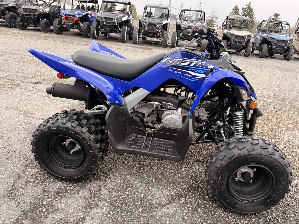 2026 Yamaha Raptor 110CALLING NEW RIDERSWith a strong 112cc engine, fuel injection, electric start and legendary Raptor styling, this youth ATV is pure fun for riders aged 10 and up.Features may include:ENGINEFuel-injected 112cc four-stroke engine is tuned for excellent low- to mid-range performance, perfect for beginning riders.Engine is air-cooled for simplicity, performance and long life with ultra-reliable wet-sump lubrication to minimize maintenance.Toolless quick-access air filter element makes servicing a snap.Large 1.8-gallon fuel tank means more time on the trail.Fully automatic, continuously variable transmission (CVT) means no shifting, allowing young riders to focus on the ride.Engine power is transferred to the rear wheels via a tried-and-true O-ring chain drive.CHASSIS/SUSPENSIONAn advanced frame design and optimized wheelbase are ready for serious off-road.Compact A-arm front suspension is tuned for light, sporty steering and comfortable ride quality.Preload-adjustable front shocks offer five inches of wheel travel and add to the Raptor 110's full-size ATV look.A five-way preload adjustable rear shock offers 5.7 inches of wheel travel.Swingarm is set at an optimized angle for rear shock performance.Three-sealed drum brakes supply reliable stopping power and a handlebar-mounted parking brake keeps the vehicle secured.ADDITIONAL FEATURESAggressive sport ATV styling is unmistakably inspired by the mighty Raptor 700R, so little ones can ride like their heroes.