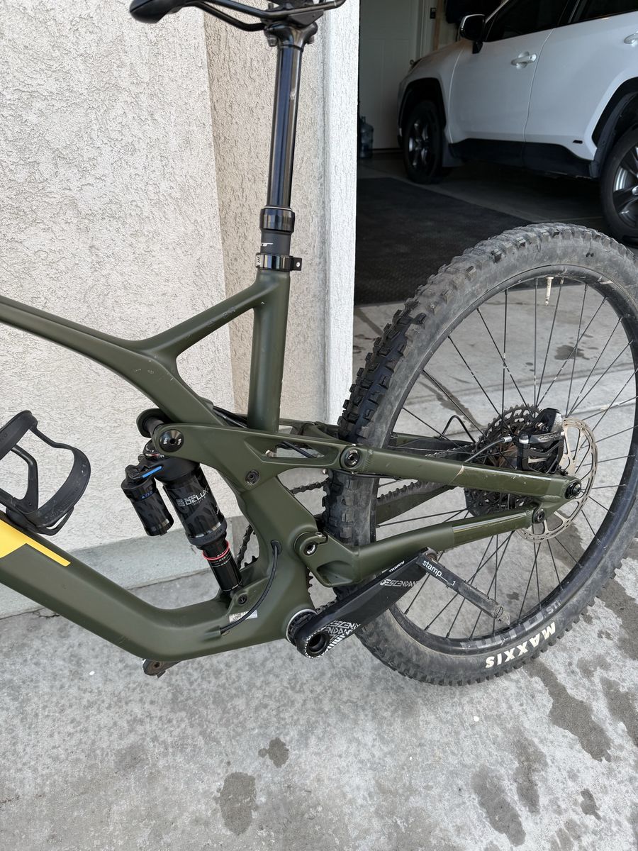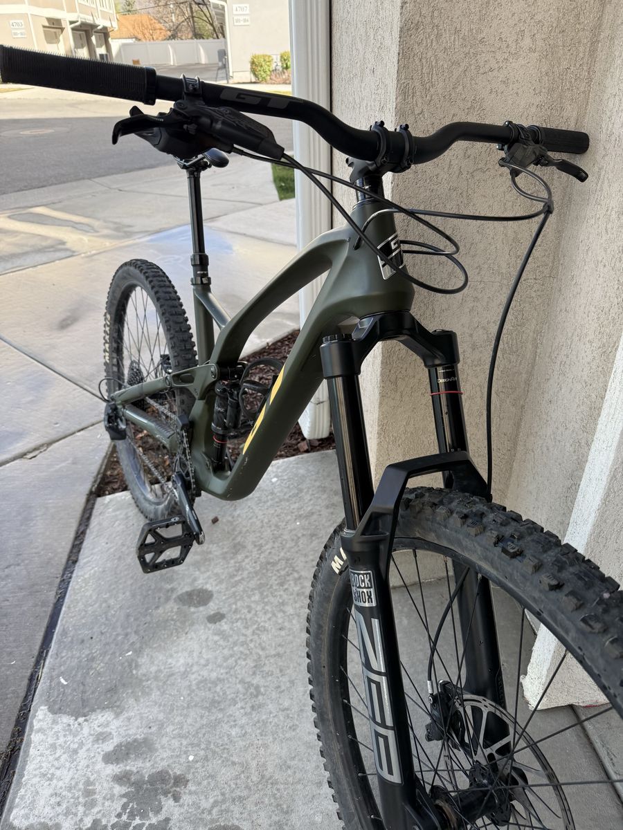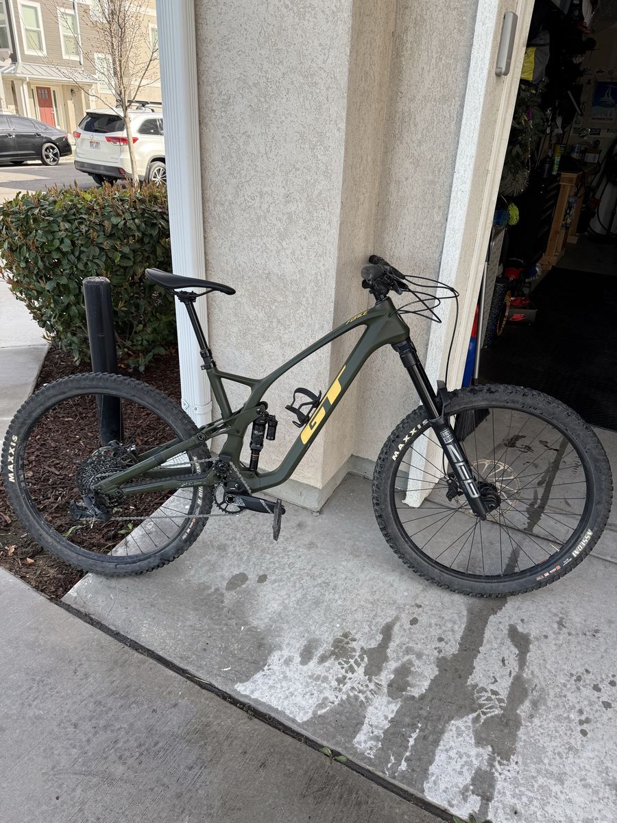 Awesome GT Force mountain bike. Has RockShox ZEB fork and Deluxe rear shock. Maxxis tires. Dropper post and disc brakes. Crankbrothers Stamp 1 pedals. Green frame with yellow accents.