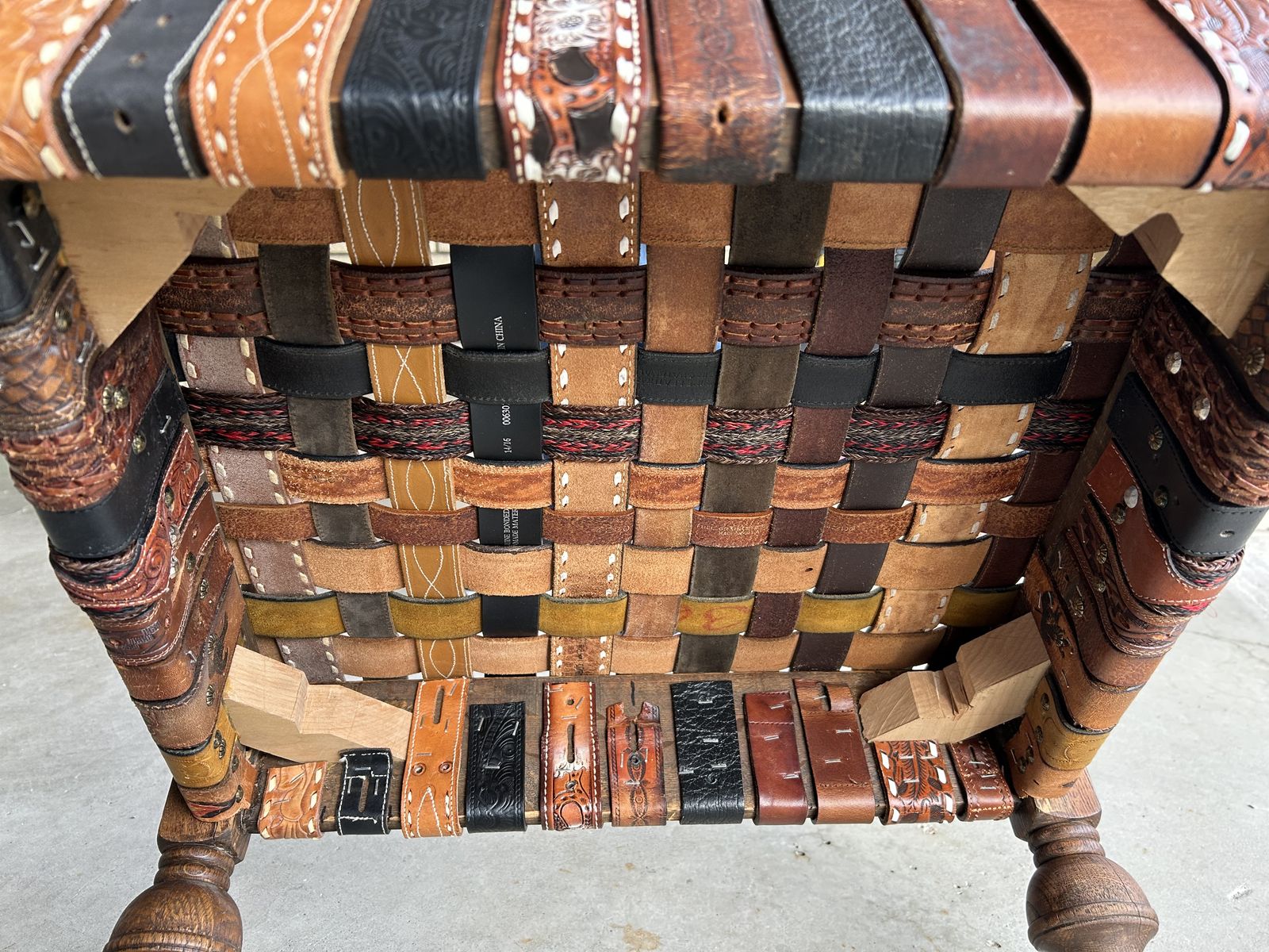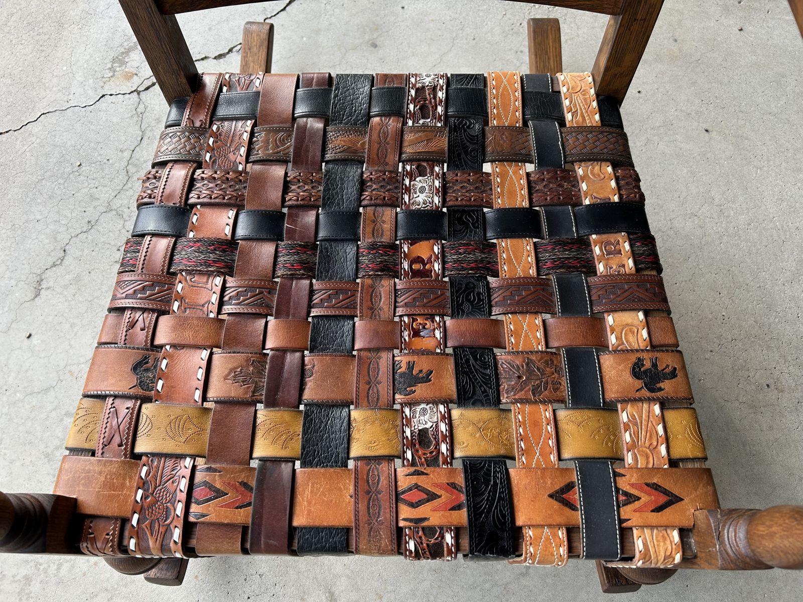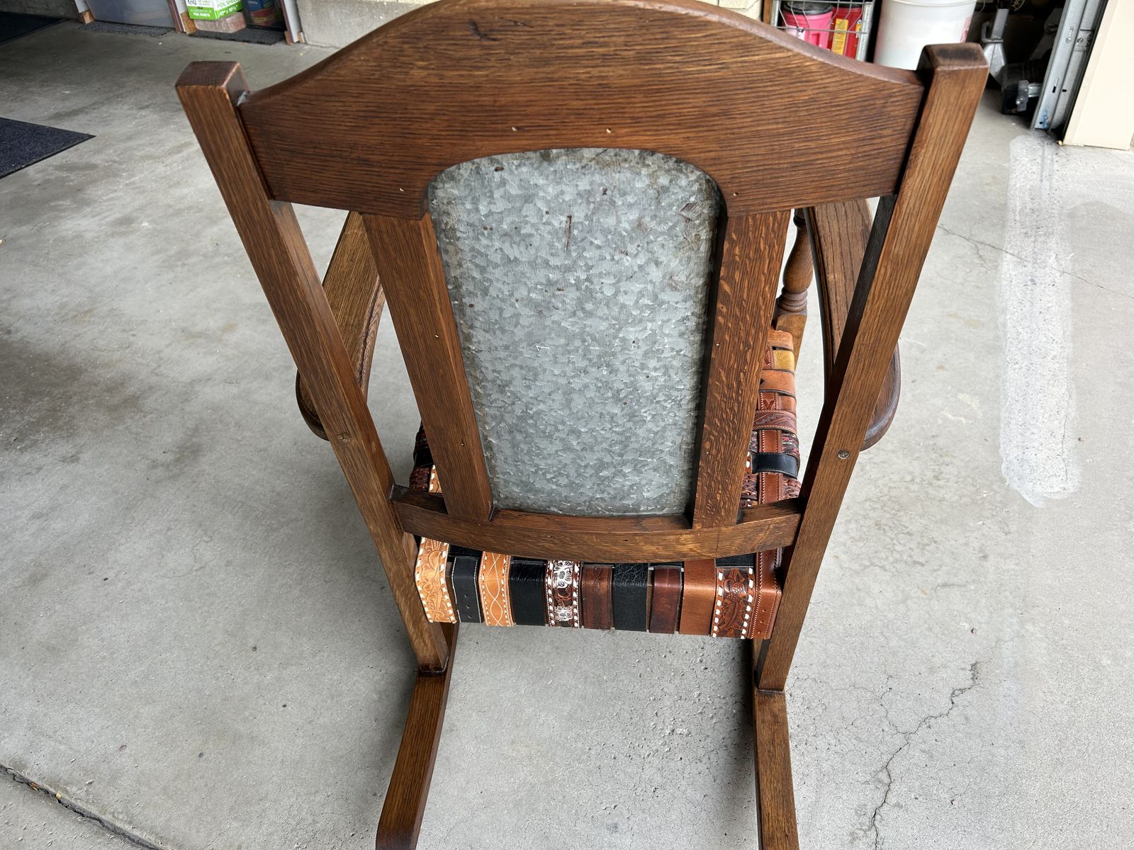 VenmoBeautiful mission oak rocking chair with unique tin insert back and labor of love handmade leather belt seat. This chair would be great in a cabin, on a porch or a den, etc. western fun and unique. Seat height 14", backrest height 37 ", width 25.75", rocker length 31.5", seat depth 19.5".