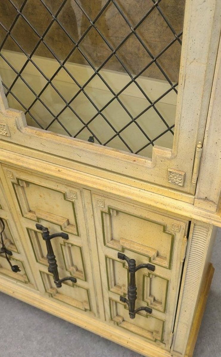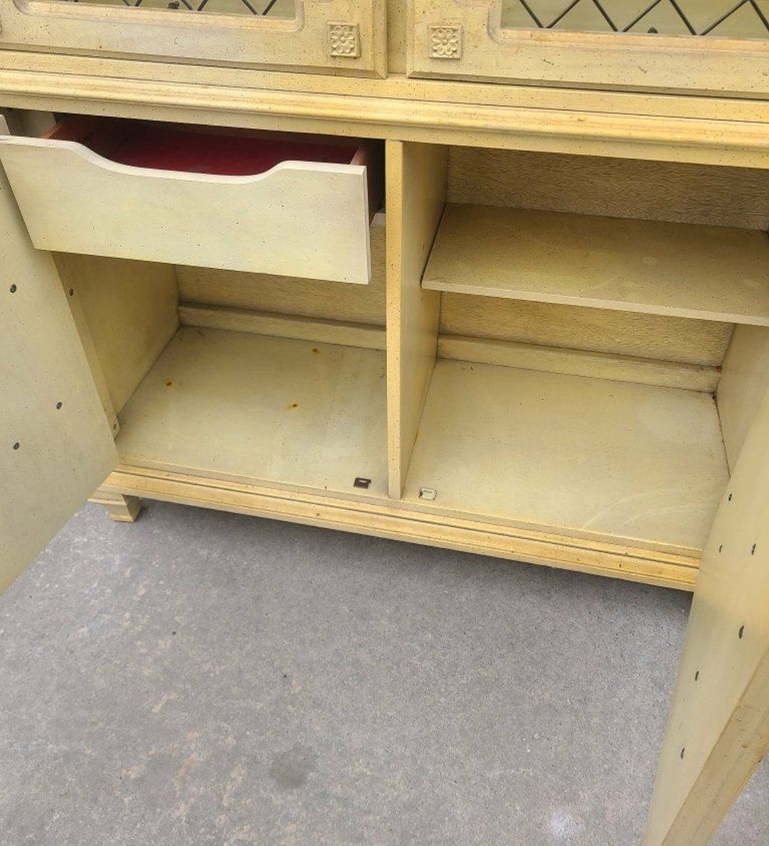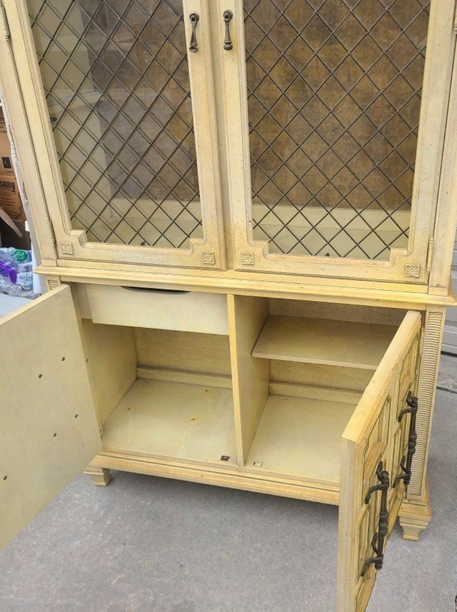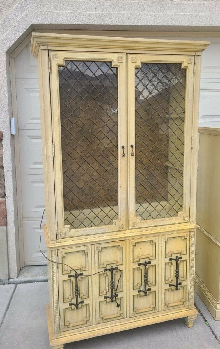 Beautiful, Vintage Light up China kitchen hutch or storage center. Measurss 43x15.5 and 81" tall. Great condition, solid wood, all 1 piece. glass is behind the metal like decorative bars. such a neat piece.