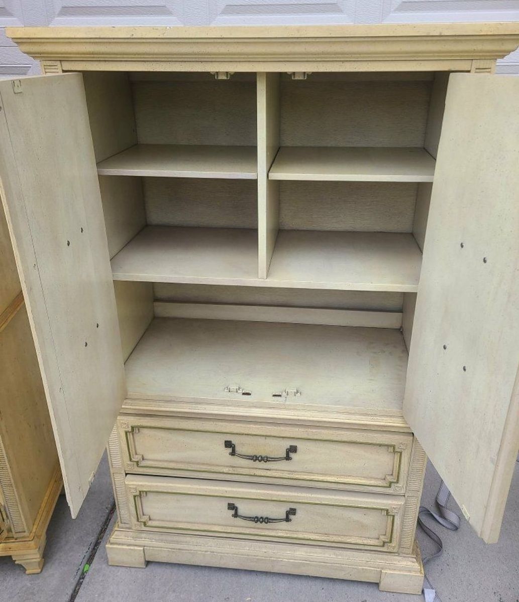 Vintage Armiore bedroom cabinet or Entertainment center, 2 drawers on bottom, storage on top, measures 38x20" and 59.5' tall.