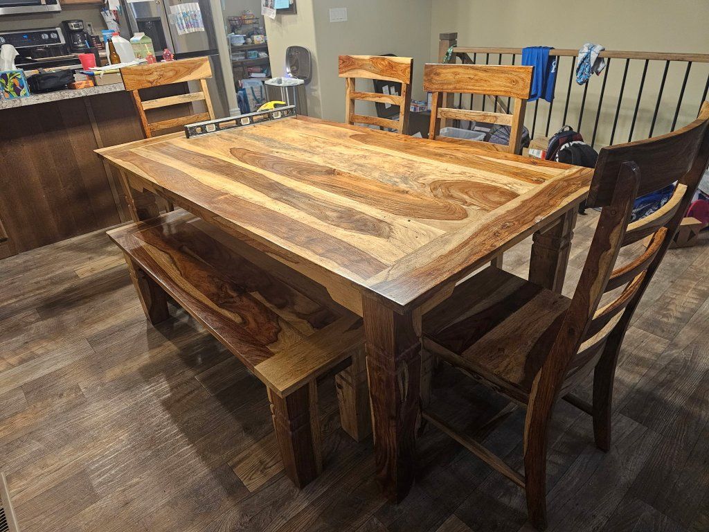 Dinning table set. Comes with four chairs and a bench. Been a good table, my family has out grown it. $400 OBO