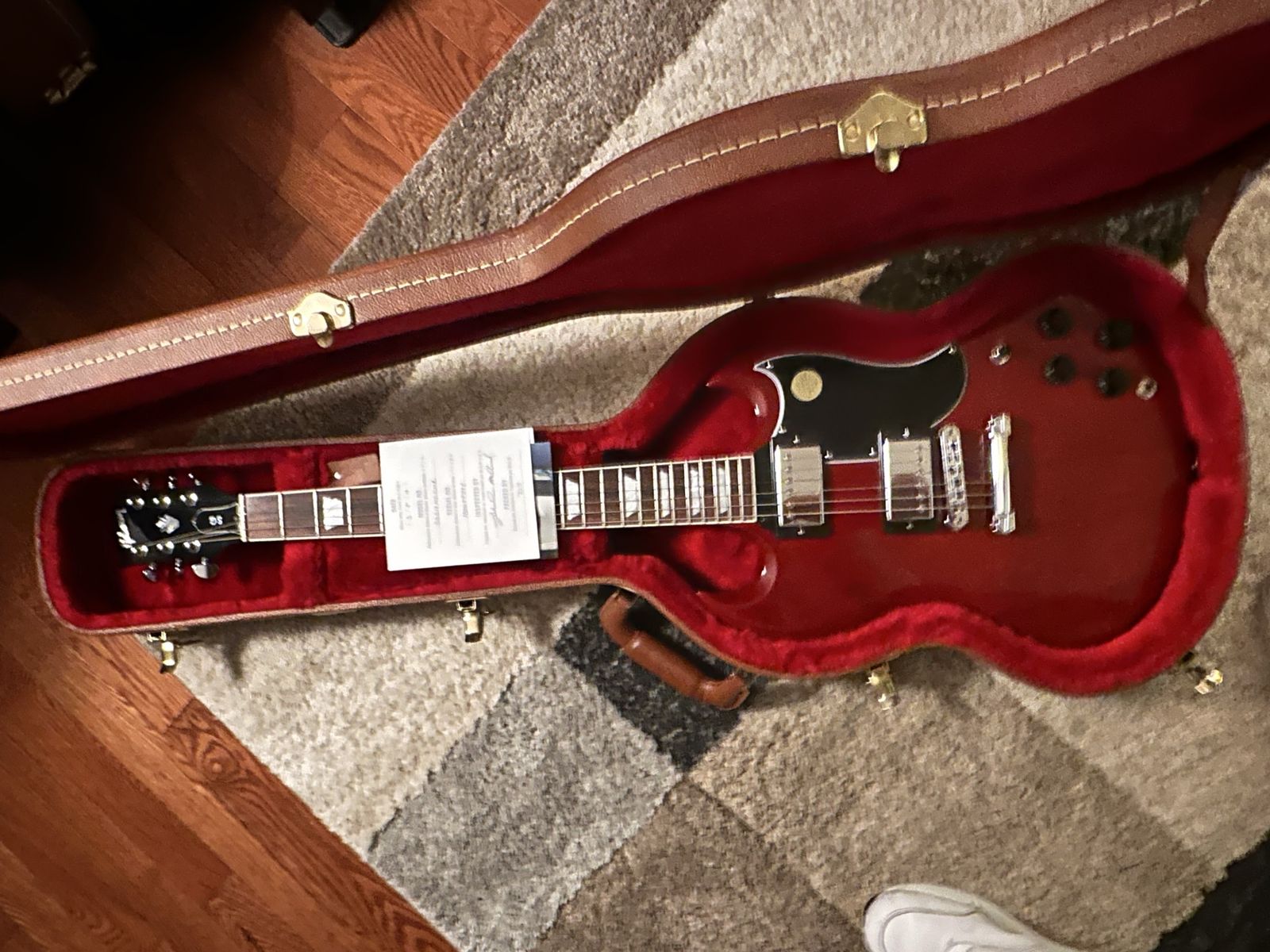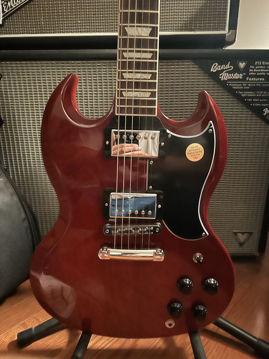 Turn up the heat with this used 2018 Gibson SG Standard in classic Cherry, a lightweight solid-body electric built for fast playability and iconic bite. In good condition, it features a mahogany body and neck with a rosewood fingerboard, dual humbuckers with a 3-way selector, and the familiar 24.75" scale length for smooth bends and rich sustain. A true rock staple with timeless looks and unmistakable SG tone. 61R/61T humbuckers, locking kidney tuners, and a lightweight aluminum Tune-O-Matic bridge