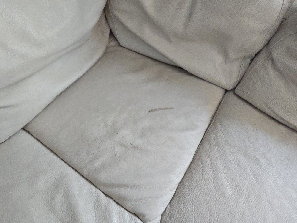 VenmoSpacious L-shaped sectional sofa is made of white leather with metal legs. This is an Italian-leather Natuzzi sofa. There is visible wear and scratches on the some of the seat cushions. It comes apart into two pieces. The back cushions also unclip. We love this couch but decided we needed something different.