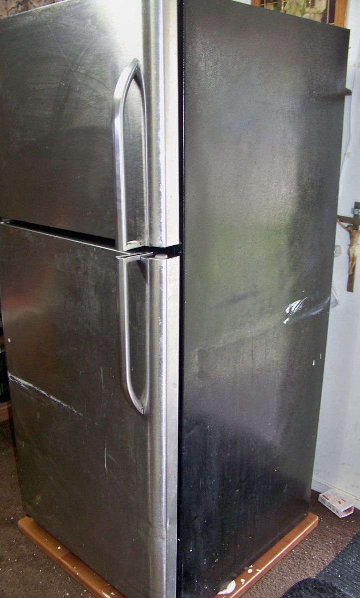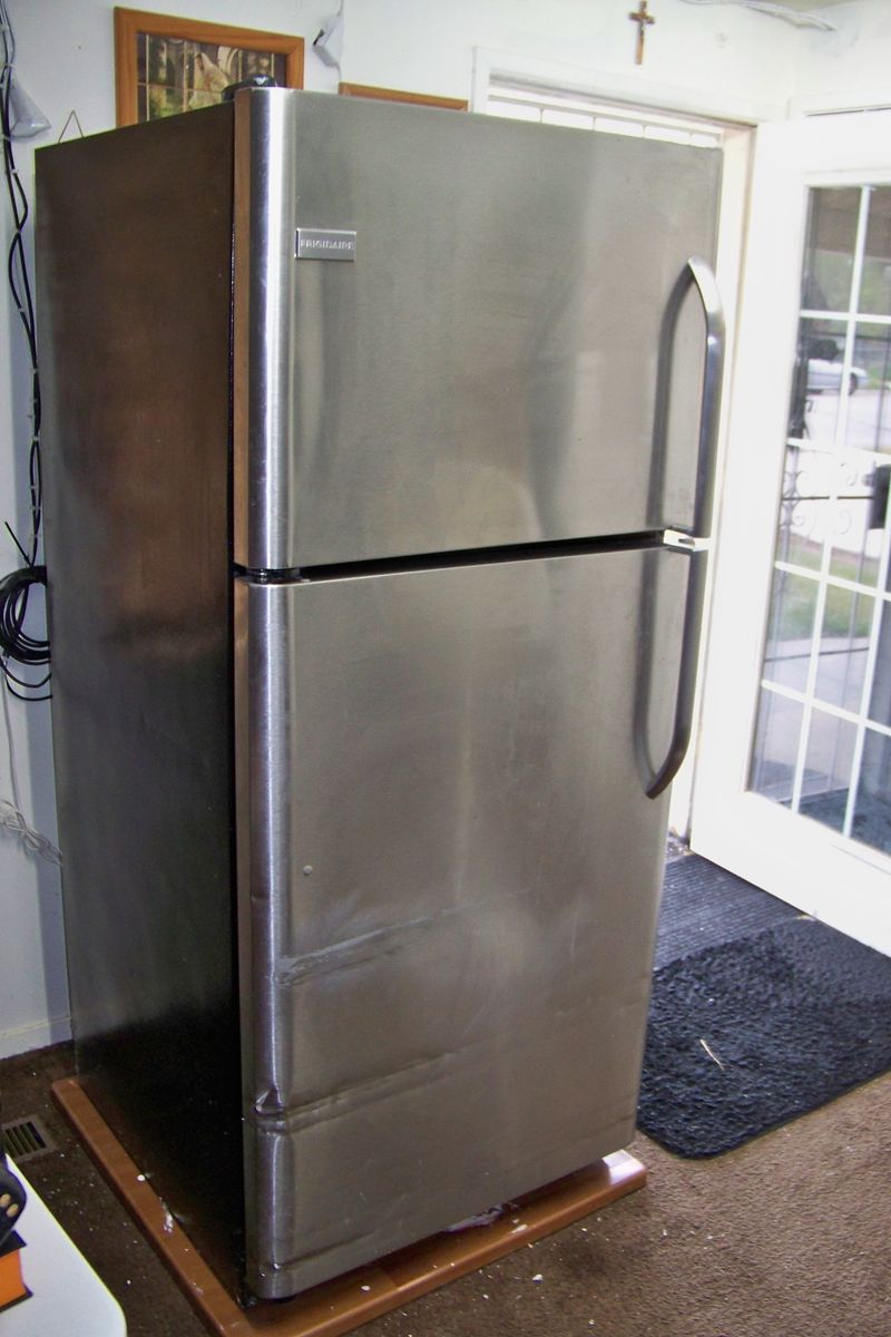 PRICE REDUCED! Was $75 - now $65! Frigidaire Fridge. 20 cubic feet. Stainless steel. Works fine. Has some dings and scratches, but otherwise serviceable. Would make a great Beer / Beverage / Party Fridge for the garage or den.