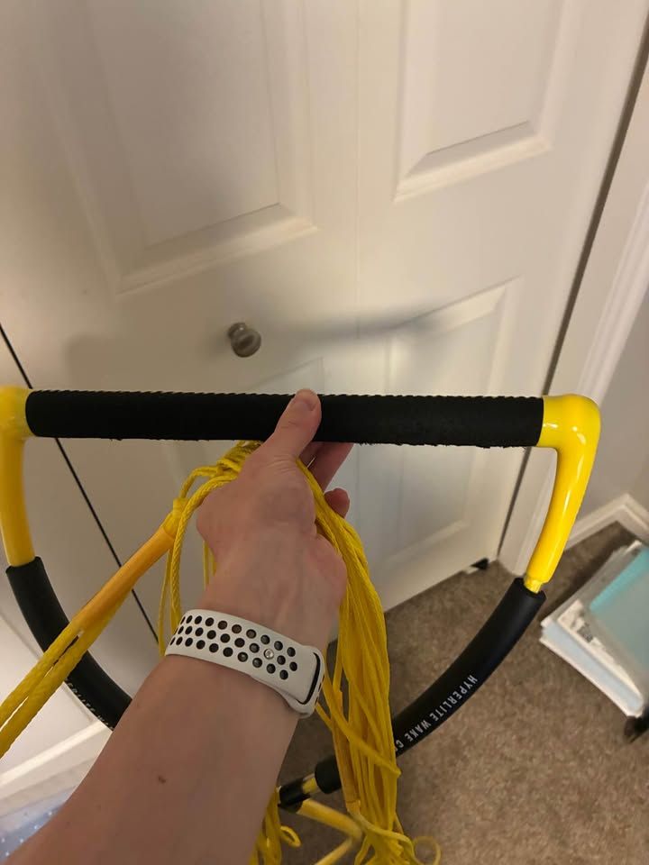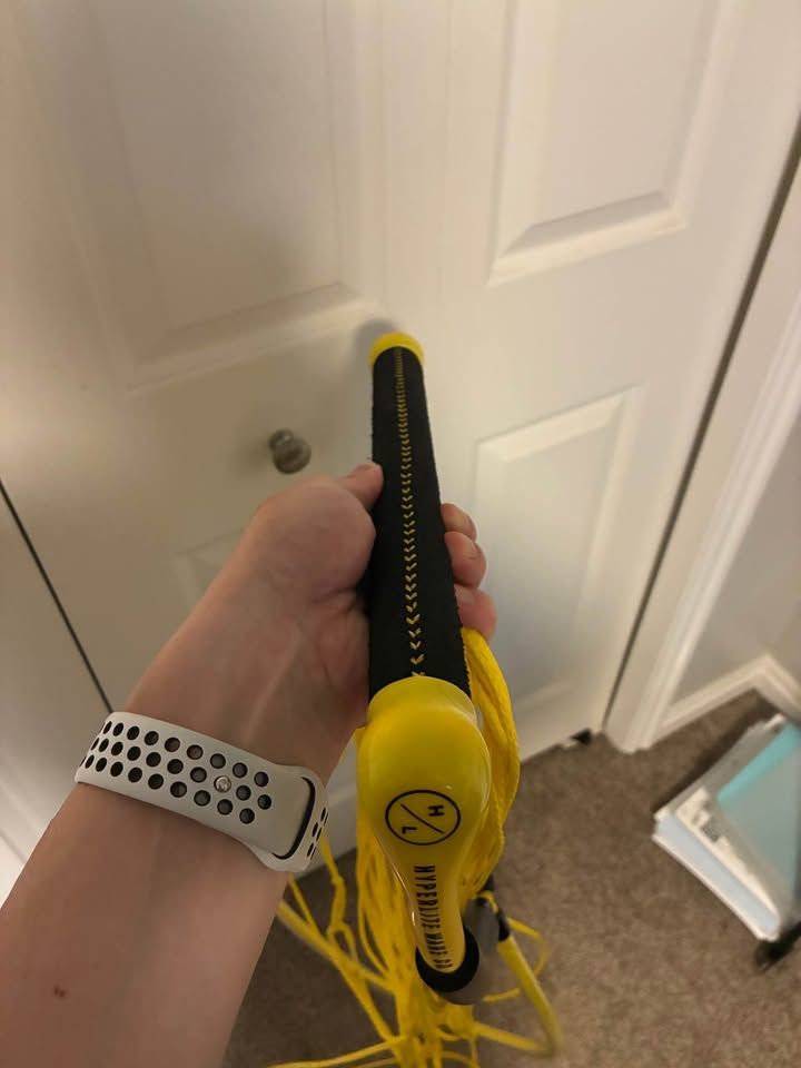 VenmoBright yellow Hyperlite wakeboard rope and handle. Handle has black foam grips and yellow ends. Rope is yellow and coiled. Ready for some fun on the water.