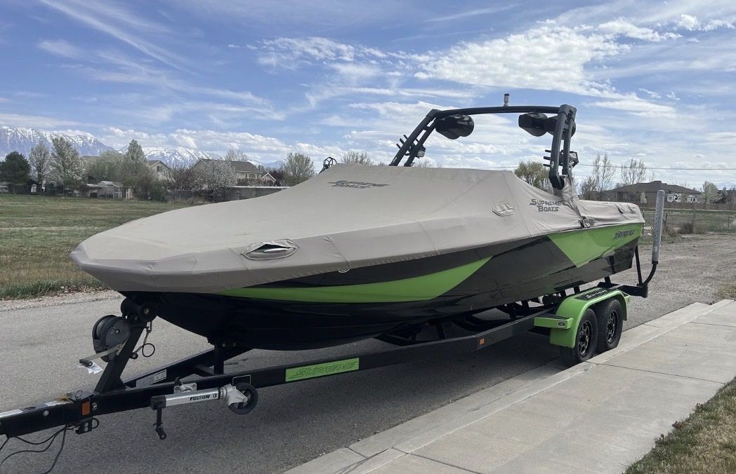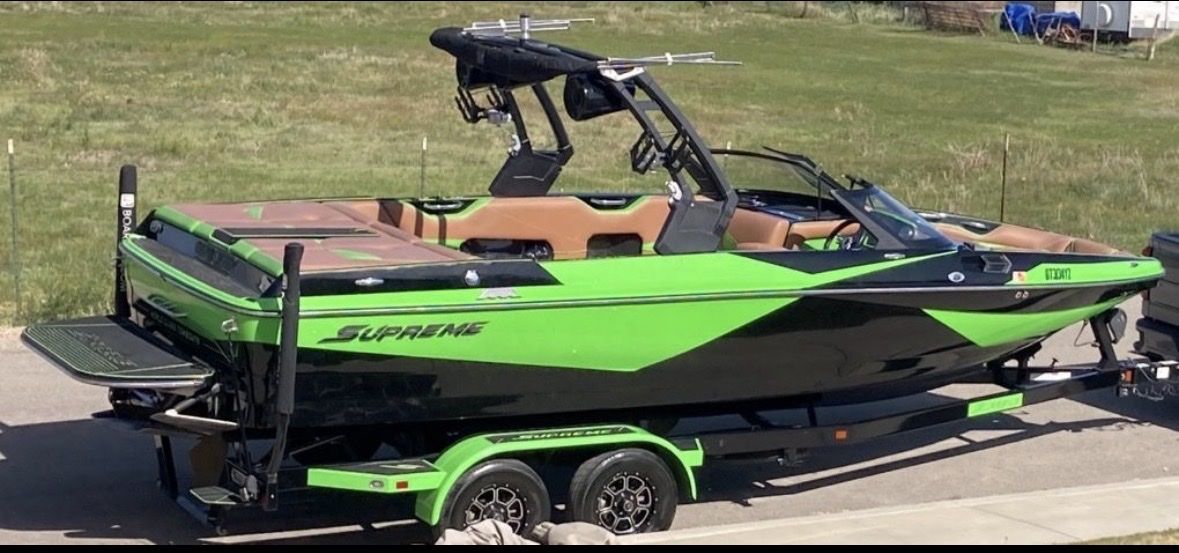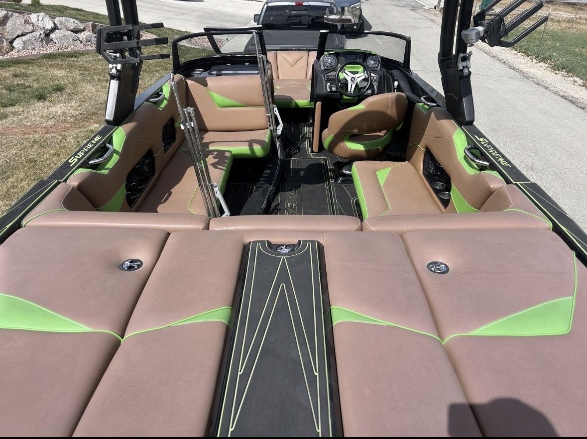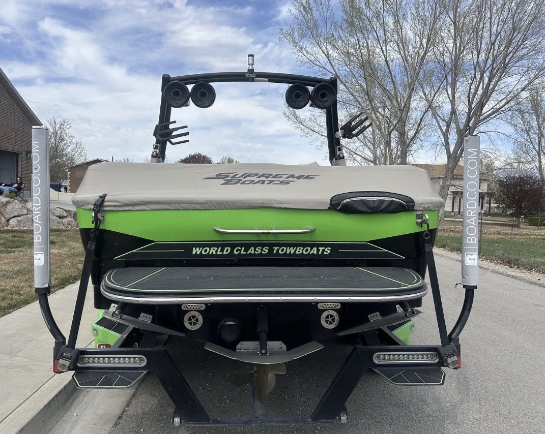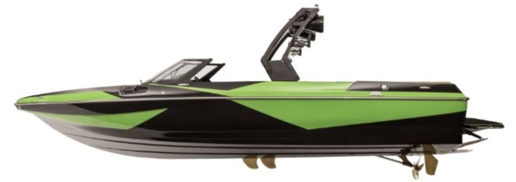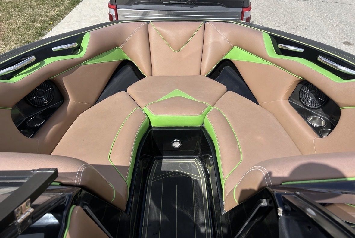 • Wakeboard tower with 4 Wet-sound tower speakers. • Cruise control • Flooring: GatorStep, depth finder, LED lighting • Dual-axle trailer included Interior & Layout • Very spacious layout with lots of storage • Lots of space for surf watching • Large sun pad and swim platform • Tower positioned slightly farther back for better visibility and rope clearance