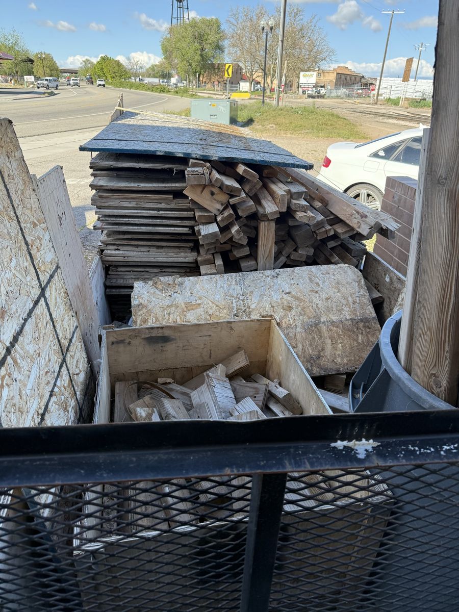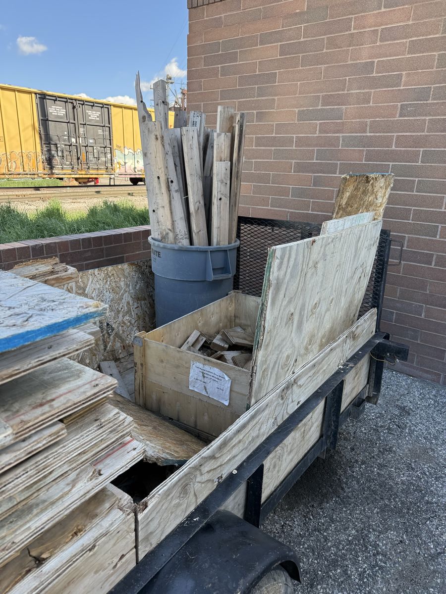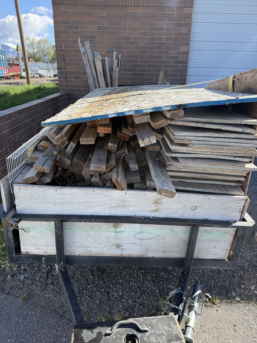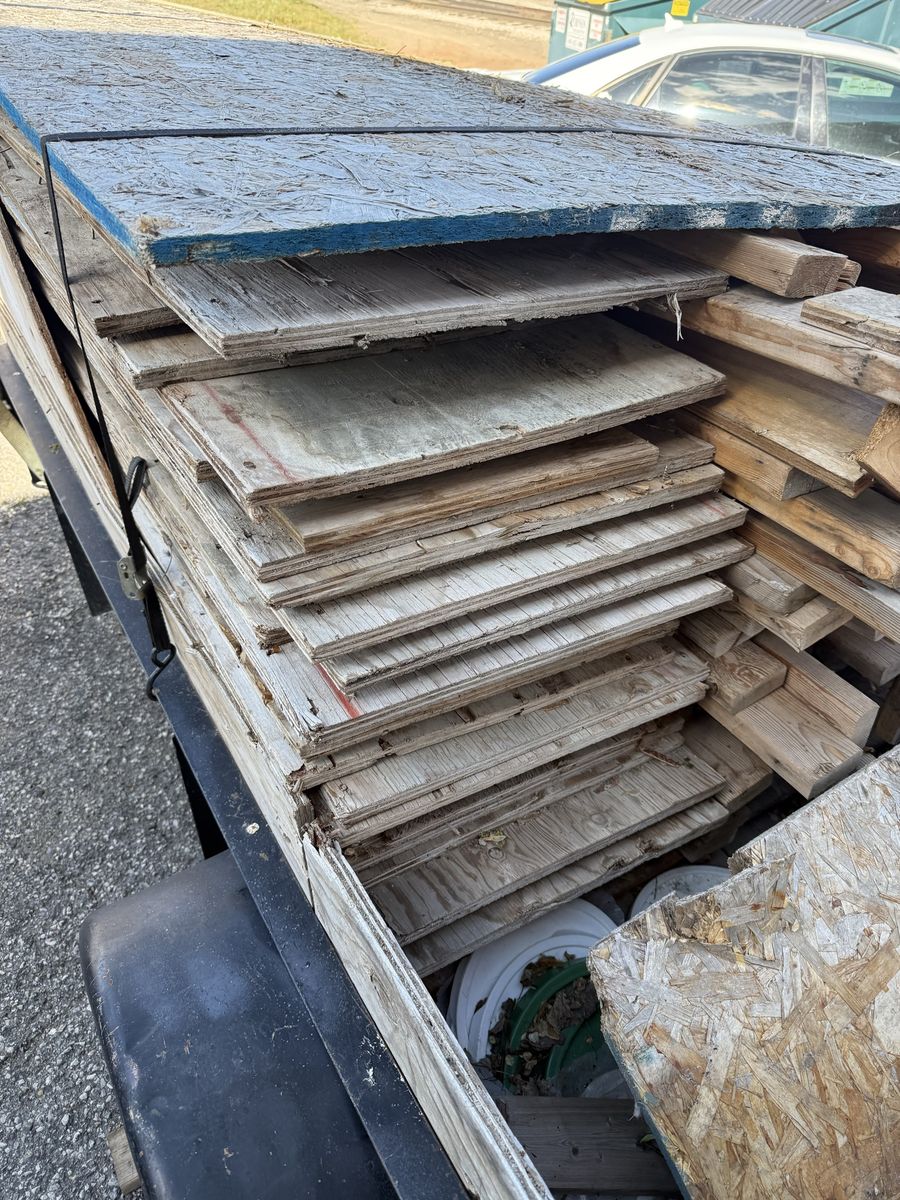 Includes: Stack of plywood/OSB sheets (various sizes) Assorted dimensional lumber (2x4s, 2x6s, and similar cuts) Additional wood scraps and blocks Bucket of longer wood posts/stakes