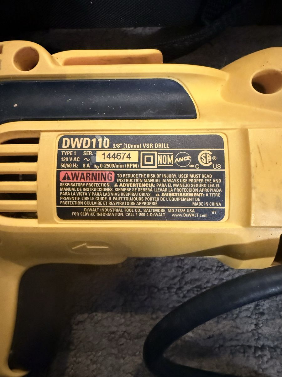 DEWALT DWD110 3/8” corded drill in good working condition. Strong motor, variable speed trigger, and solid build quality—great for home projects or jobsite use.