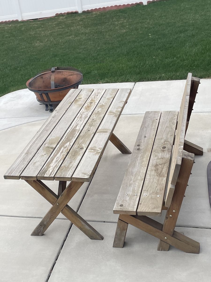VenmoSturdy wooden patio table and bench. As you can see it needs to be refinished if you want it to look nice. Table: 6' long 28.75 wide 30 tall Bench: 6' long 28.5 wide 36 tall