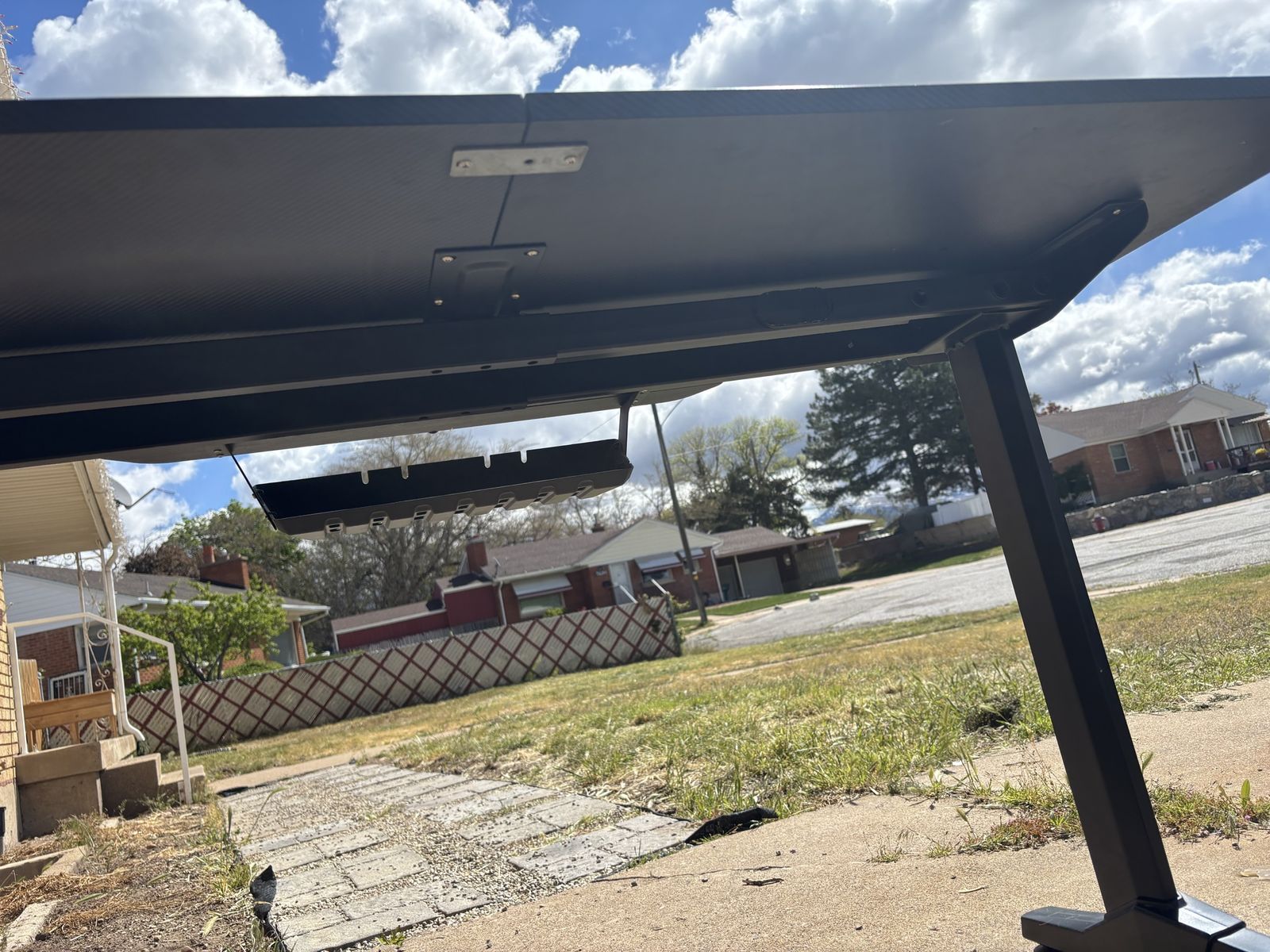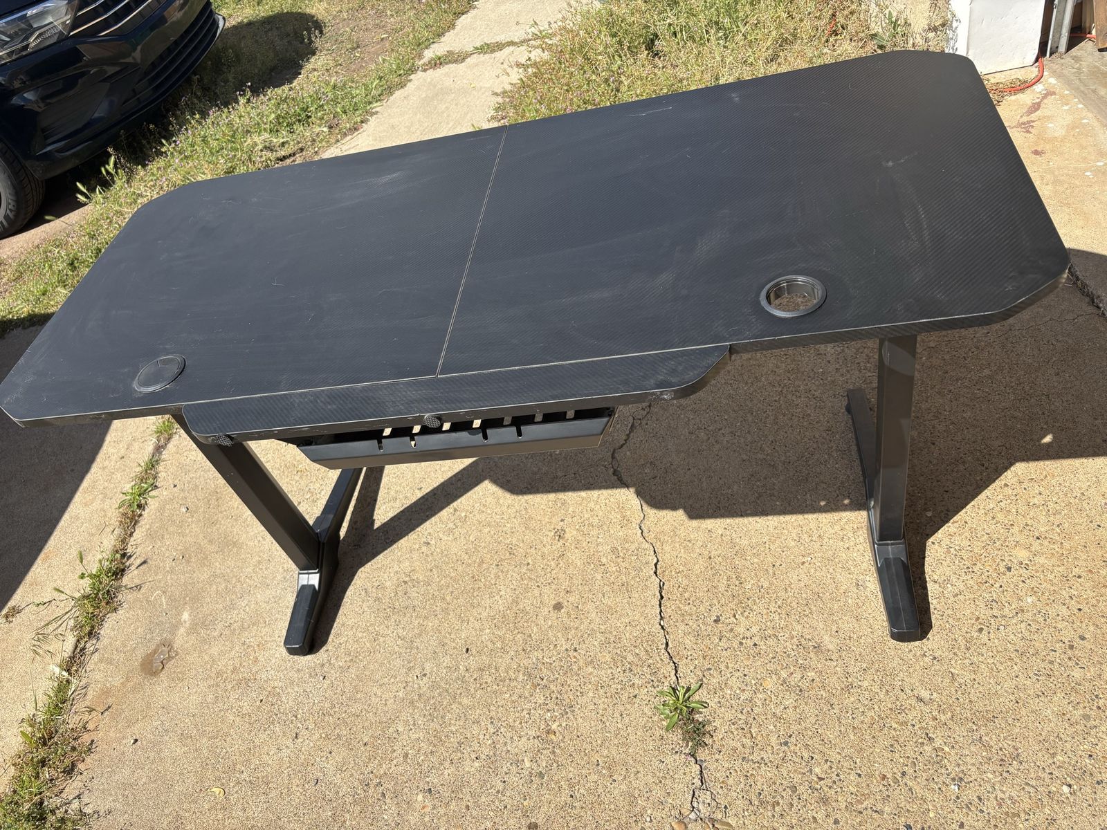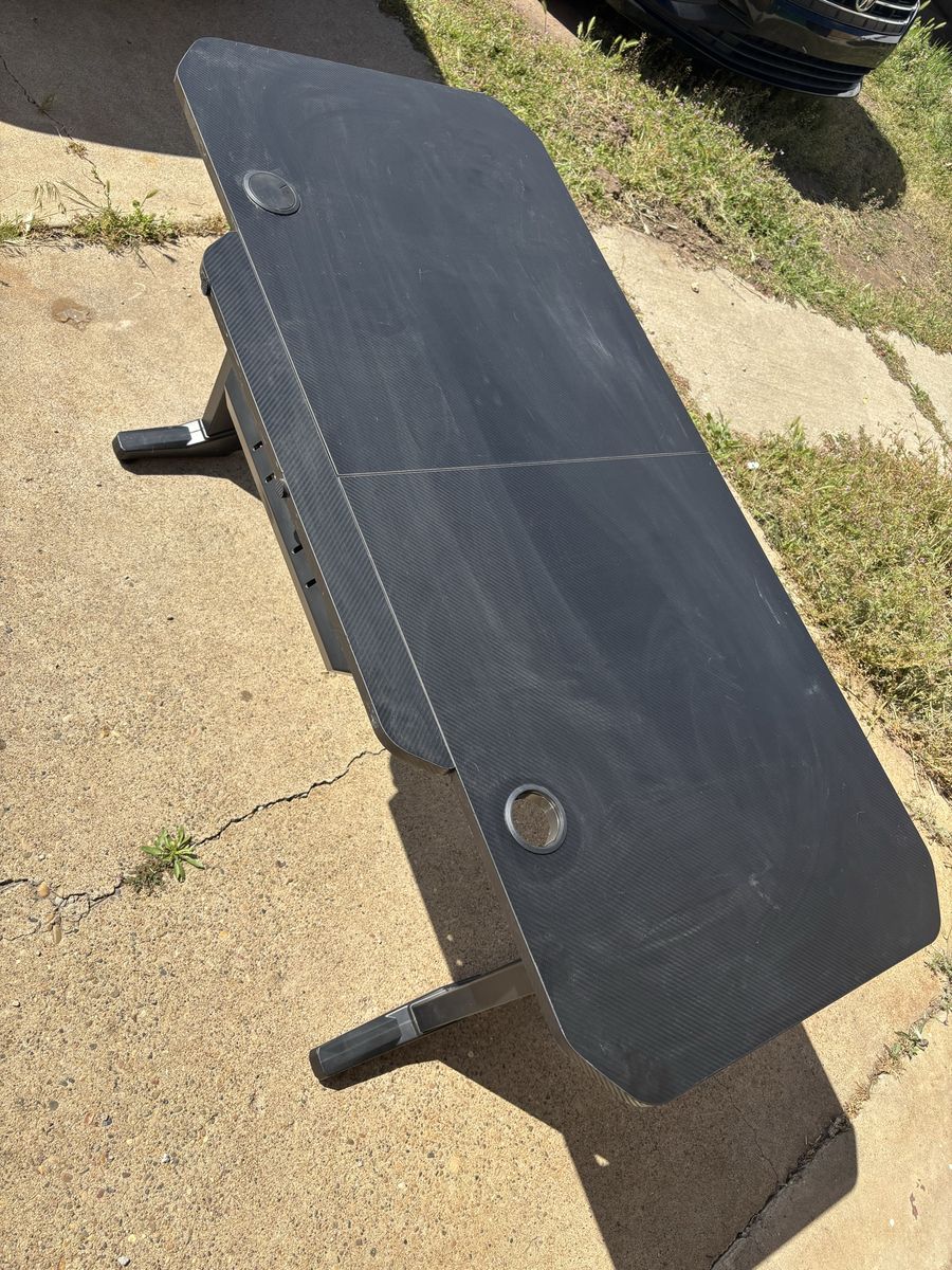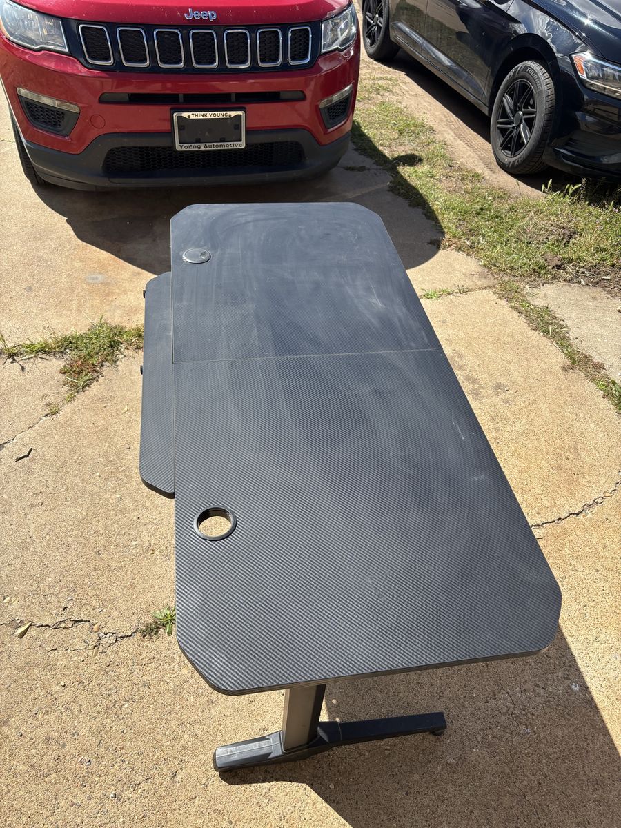 Great condition 55x26 at its widest, carbon fiber look, has cord holder tray and headset holder hook