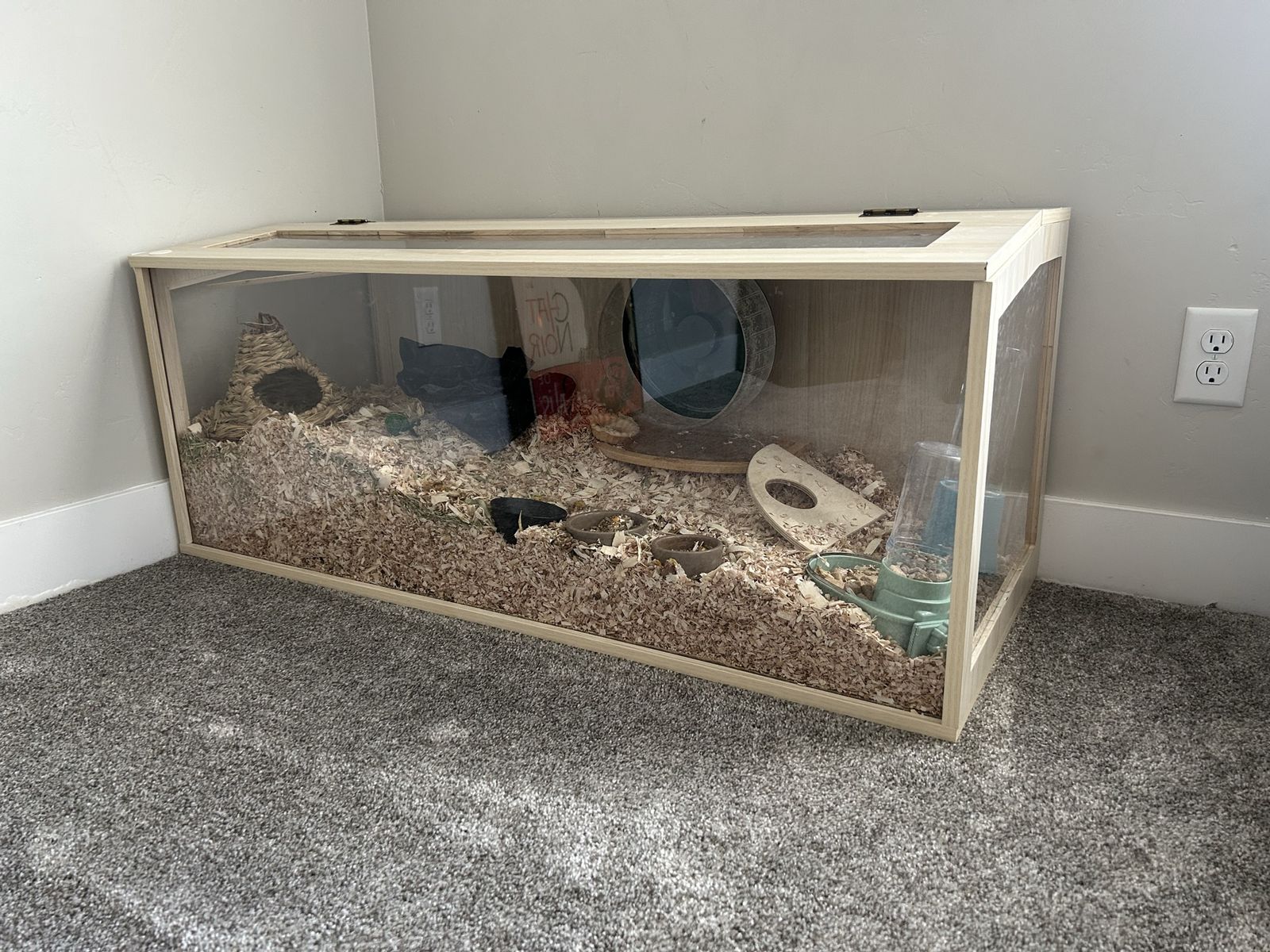 ApplePayI will have the bedding cleaned out, but I can include the supplies that are inside like the wheel, dust bath, and food and water bowls