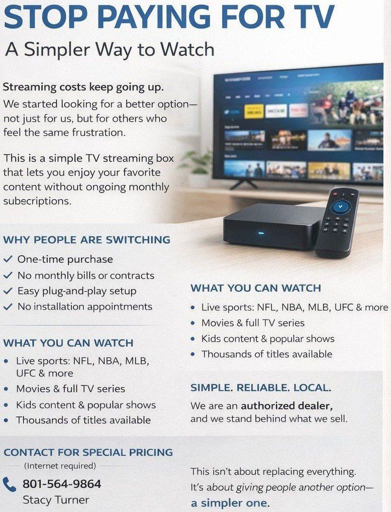 STOP PAYING FOR TV A Simpler Way to Watch Streaming costs keep going up. We started looking for a better option—not just for us, but for others who feel the same frustration. This is a simple TV streaming box that lets you enjoy your favorite content without ongoing monthly subscriptions. WHY PEOPLE ARE SWITCHING One-time purchase No monthly bills or contracts Easy plug-and-play setup No installation appointments WHAT YOU CAN WATCH • Live sports: NFL, NBA, MLB, UFC & more *LIVE TV with seven day playback • Movies & full TV series commercial free • Kids content & popular shows • Thousands of titles available SIMPLE. RELIABLE. LOCAL. We are an authorized dealer, and we stand behind what we sell. CONTACT FOR SPECIAL PRICING (Internet required) 801-564-9864 Stacy Turner This isn’t about replacing everything. It’s about giving people another option— a simpler one. CONTACT FOR SPECIAL PRICING (Internet required) 801-564-9864 Stacy